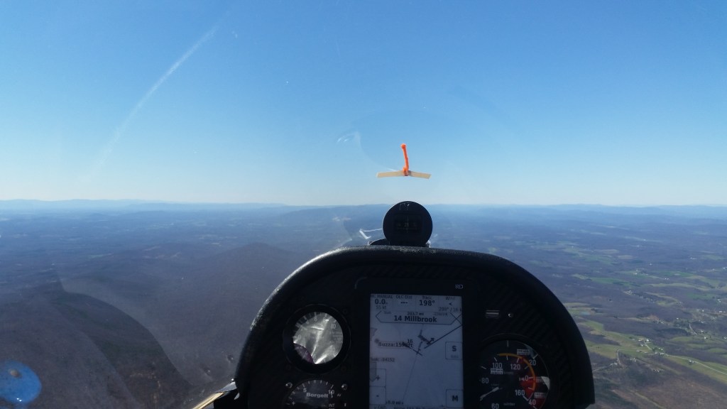 At the NE end of the Massanutten, now I have to make the trickiest jump of the day. The wind shifts to 260ish and only 12 knots. This actually makes the jump to Great Northern much trickier because I would no longer be able to make easy use of the streets. Furthermore, the wind shifted considerably with altitude. It went from 260 to about 290 as I climbed up through the thermal to around 4500ft. I was working quite hard to poke along in good air, but inevitably I would drop out into the sink and have to deviate crosswind until I got something better. I struggled to Great Northern and ended up short and not high enough to cross. I cut across crosswind, looking for a reasonable climb. It was quite exciting… the conditions aren’t that great and I am over 230 miles from home. Finally, I hit a climb and it gets me just high enough. I had enough to scoot over the top of the ridge.