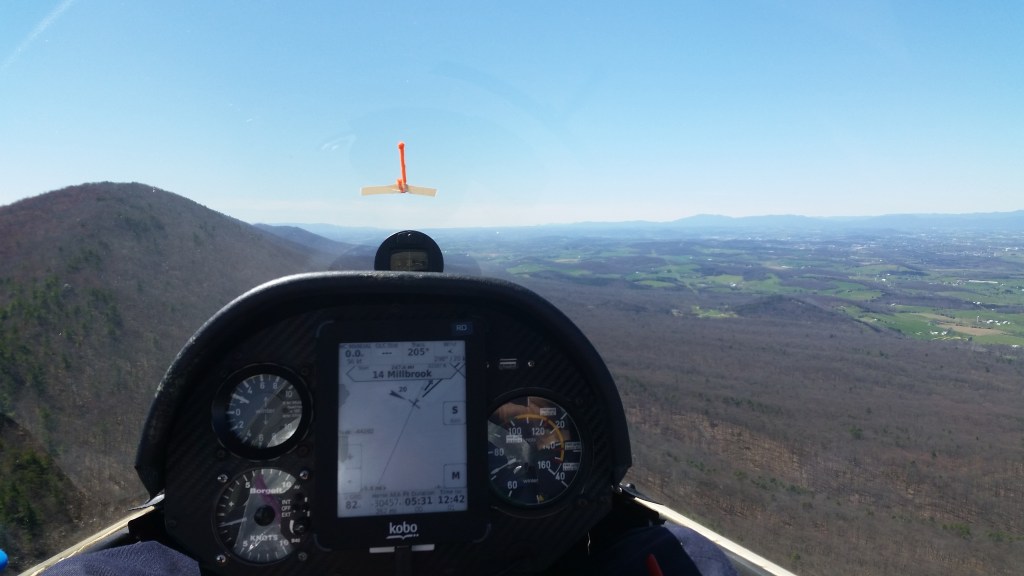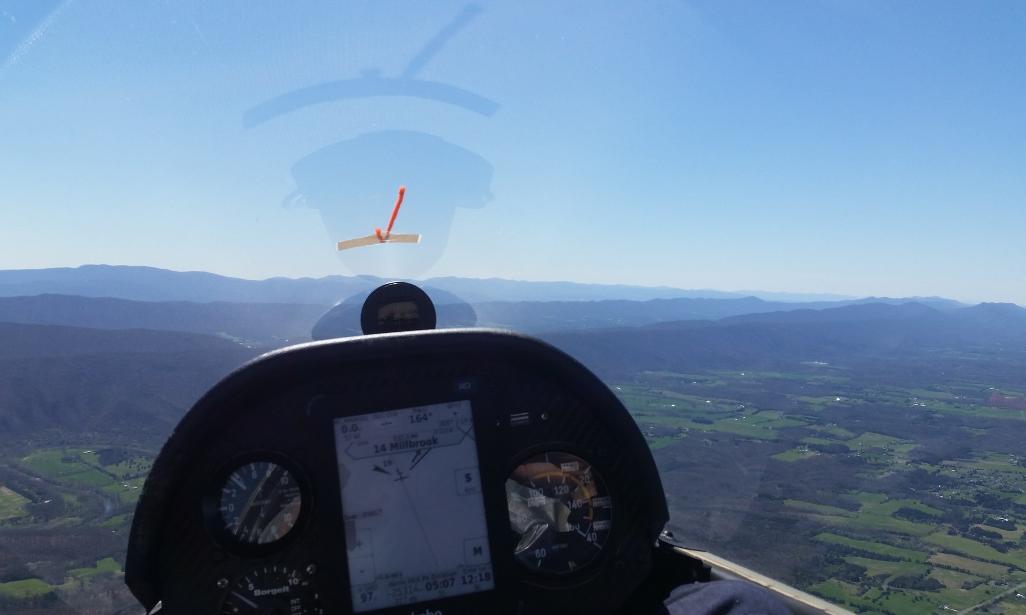 Passing by Front Royal, I connected with the ridge. The wind is weakening, though the band is working nicely several hundred feet above the ridge. I coasted in to Harrisonburg, got the turn and got out. Now it is a matter of racing back before the high pressure builds in. The wind was to weaken and get more SWerly over time.