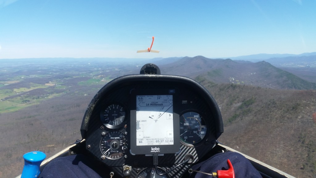 This was a partial factor in a pretty big screwup. I hung a left at Sidney’s Knob toward the tip of Shade Mountain (Gobbler’s Knob). I left at an altitude I had left before, but did not hit the good air I normally find there. This was still okay; I was going to slide around the tip just a bit below ridge top. But that was until I hit 13 down and dropped out of the sky like a set of car keys. I had my field picked out and my hand was on the gear handle. If I couldn’t clear the ridge ahead, I was ready to bank left and go for it. I ended up scooting over the ridge, with a field picked out ahead. As I rounded the corner, I found good air. Yay! I S-turned several times and got higher. I am home free, high enough to connect with Shade. I got really lucky on that one…