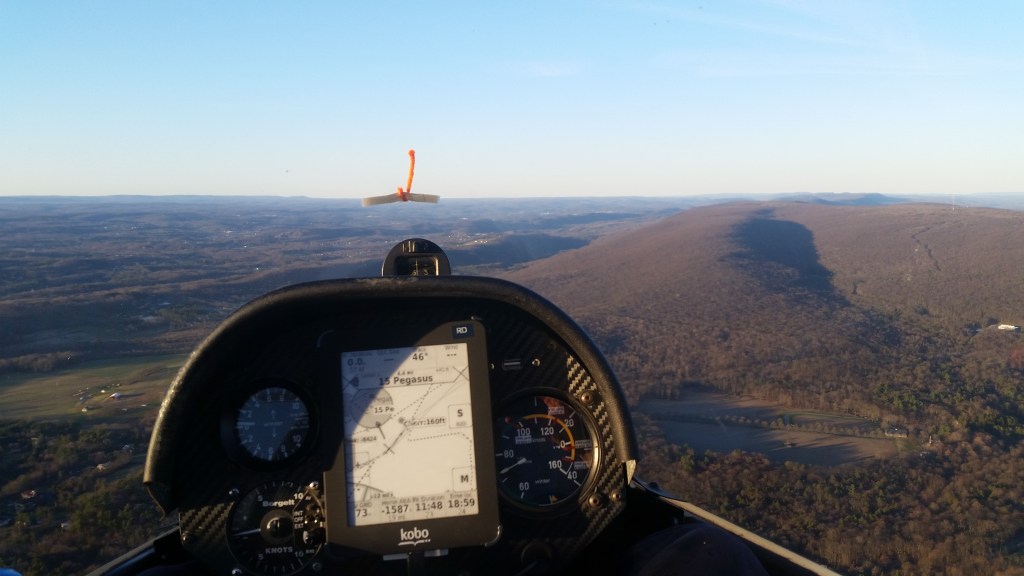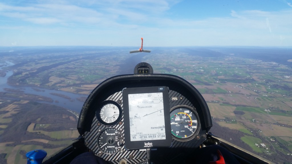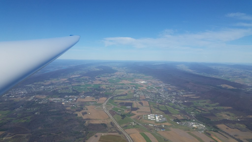 I finally found a reasonable climb just past Knauff’s place. I climbed up to 6000ft and scooted over the top of the State College Delta. I worked the downwind street and kept my speed up. This was the absolute tail-end of the thermal day and I needed to get as far as I could before the day shut down. The timing worked out; I actually found my highest climb at 4:50pm to 7500ft. It was really pretty, floating over the Susquehanna valley.