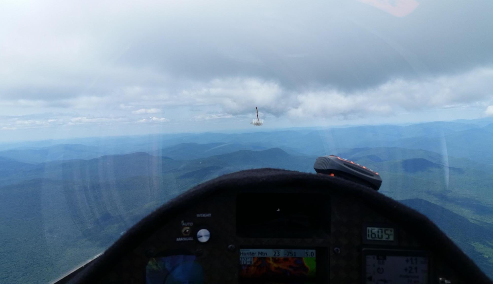 Making it across to Indian Head Mountain, I did not find a single thermal. I started heading toward “Strip in the woods” and hit some weak stuff. This got me up to 4500ft. At this point, I figured my best odds were to head toward Hunter Mountain airport and try to find something along the way. This finally worked and I hooked a climb just below the tops of the mountains, near the airport. A long slow grind got me back up to 5500ft and a final climb up to 6300ft was sufficient to make a safe crossing back.