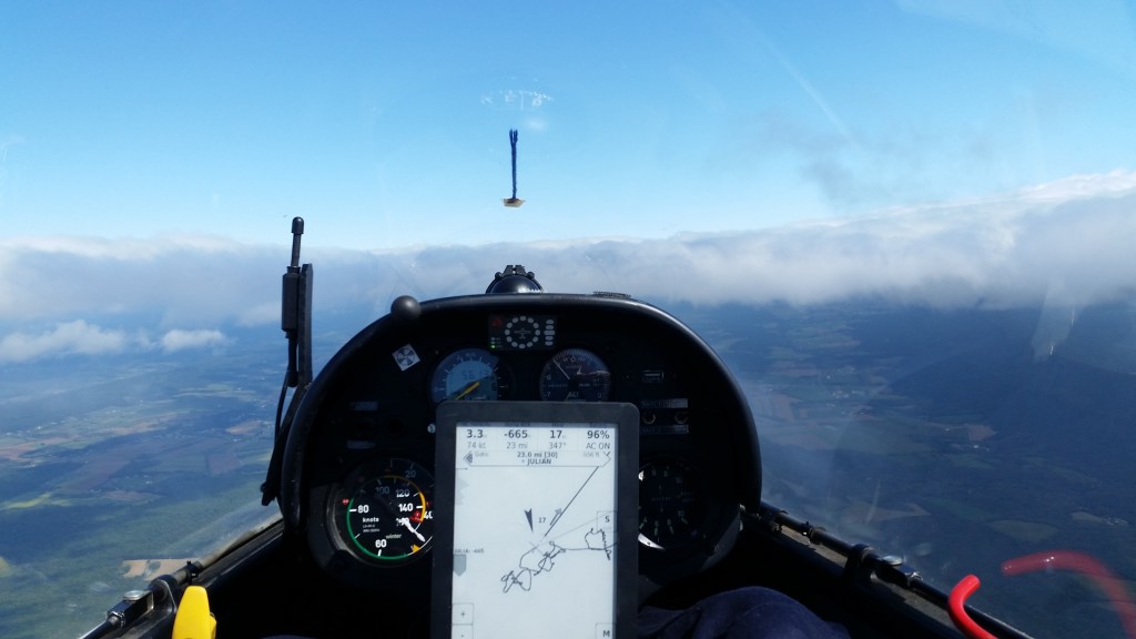 The goal now was to climb as high as possible and try to make a nice downwind run into the wave. I finally hooked a decent thermal over Bald Eagle and just started drifting in it. A little over three miles later and 900 feet higher, I was still not at cloudbase and evidently I found the down part of the wave. I had to move on.