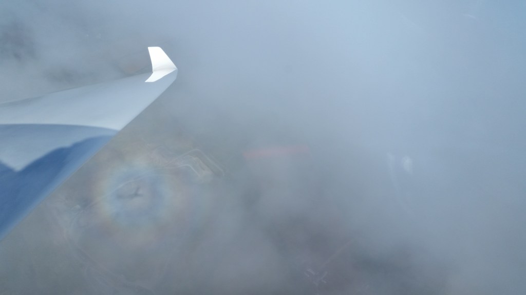 That wave got me up to 8400ft. It was considerably better defined and broader than the Tussey wave. It probably had to do with the plateau being much better aligned and shaped, which was likely triggering the wave. After floating around for a while, I explored the boundaries. Other than where it was reinforced, it was quite weak, just enough to slow down my descent. I mozyed SW of the hole, seeing if I could find a hole toward Julian. No hope whatsoever, totally overcast. But man, it was so cool looking at the undulations in the clouds. You could see subtle waves and ripples that were not strong enough to punch through the overcast. It was surreal seeing this solid ocean of cloud… it felt like magic.