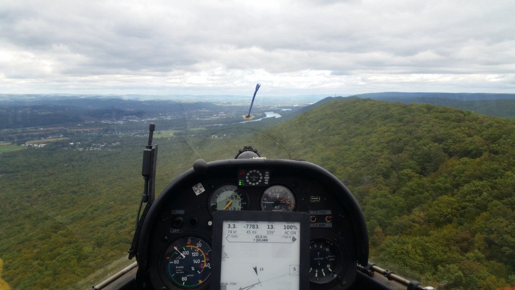Once in the air, it was clear that the ridge was working okay, though the angle was quite far off. However, there was definitely wave about and the mission became to get into it. I shot off toward Eagle Field, eyeing a gap upwind of Bald Eagle. I found rotory-thermal stuff and worked toward the gap, though it started to close in. Instead, the Tussey Gap (near Spruce Creek) got nicely defined… let’s go there instead?
