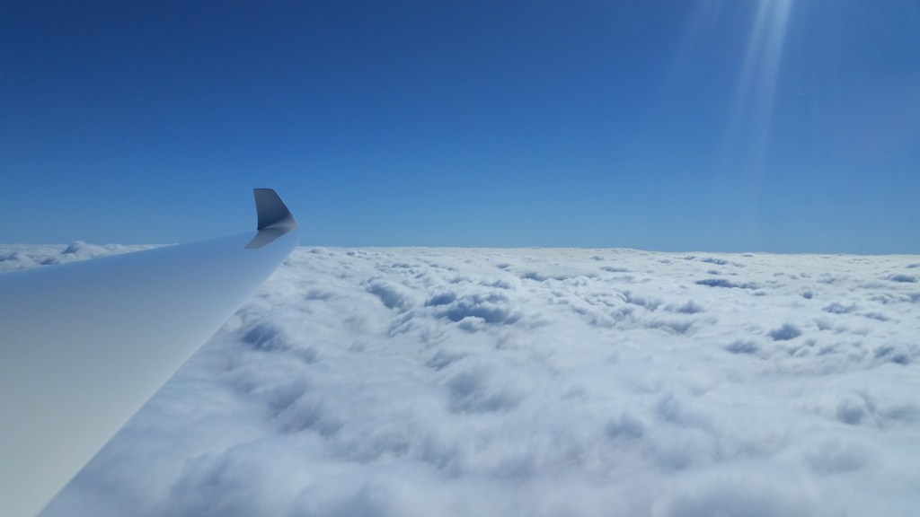 But eventually, I was halfway up the clouds and it was simply gorgeous. It was quite a bit warmer with the autumn sun beaming down from the turquoise sky. The sky had a joyful feel to it, not like the deep-blue morose look we will get in several weeks. The glider was flying so incredibly well too. I was amazed at how well the controls were harmonized. All you have to do is think about where you want to go and the glider will ease into that direction. Nothing happens abruptly, everything is graceful. And the glider does not “hunt” in the roll axis. It will track exactly where you want it to, both in turns and in the run. And of course the LS8 *goes*. I don’t think I had ever felt one with a glider as quickly and effortlessly as I did with this ship.