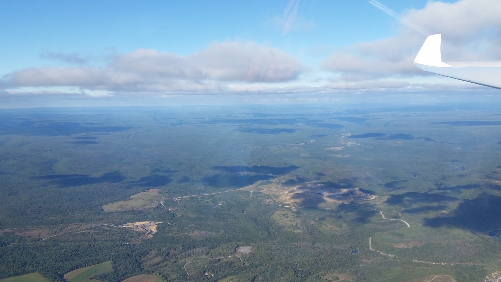 Getting back beyond Howard Dam, I saw the high pressure system building in and it was now convectively active. Yay, now I can go and thermal this ship! I found a street just before Milesburg and worked my way into the plateau. Man, this glider thermals soooo nicely! When it buffets, it whispers in your ear, “Can you please speed up a little?”