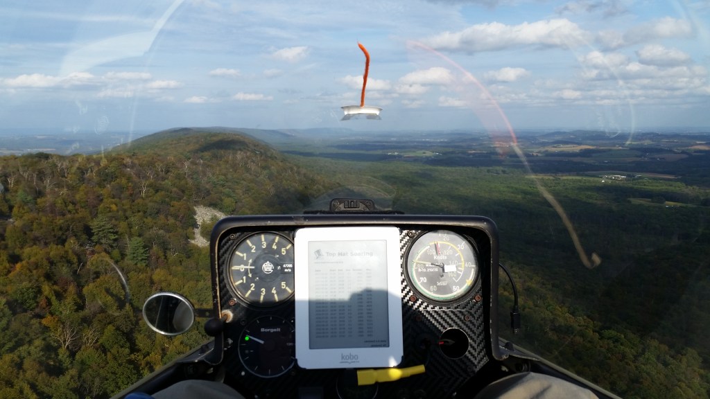 Following a quick tow, I had no trouble climbing up. The wind was very Southerly, easily 200 degrees. This was expected with this sort of day. This type of set up normally builds in as the day goes on, with the stronger winds SW. However, it requires flying the first hour of the flight quite conservatively… the thermals are not that good and you can’t count on simply dumping down on the trees and the ridge working. But up at 2600ft and the sky looking quite good SW, I slowly started floating toward Hawk Mountain. “No need to rush!” I told myself. The cumulus clouds were heading my way and I didn’t want to end up in one of the fields on the far side of the Delaware Water Gap.