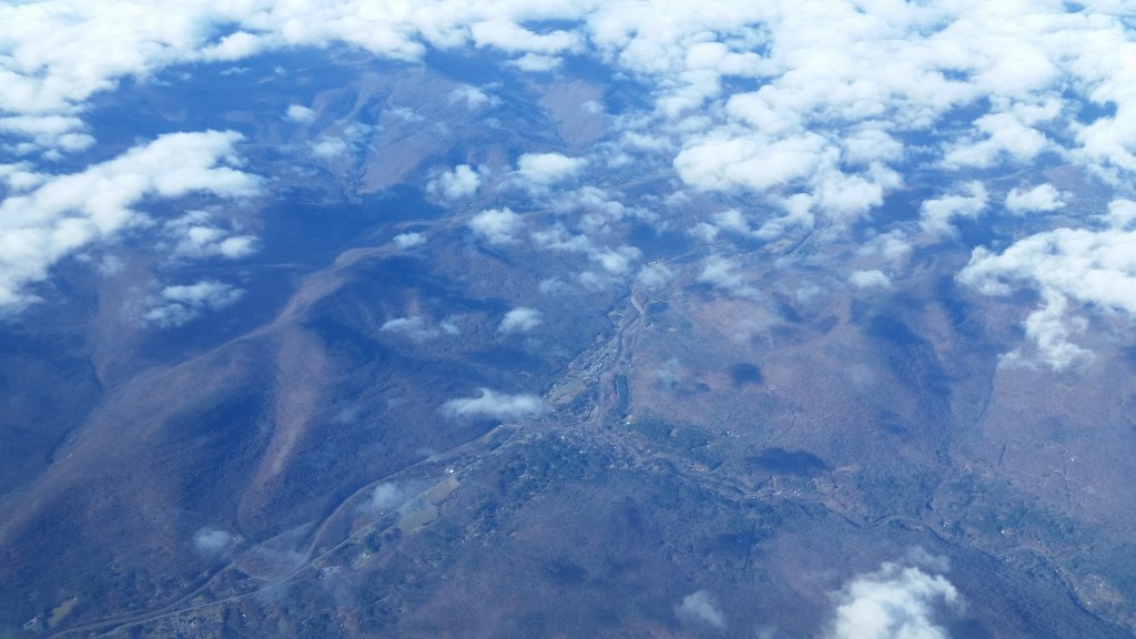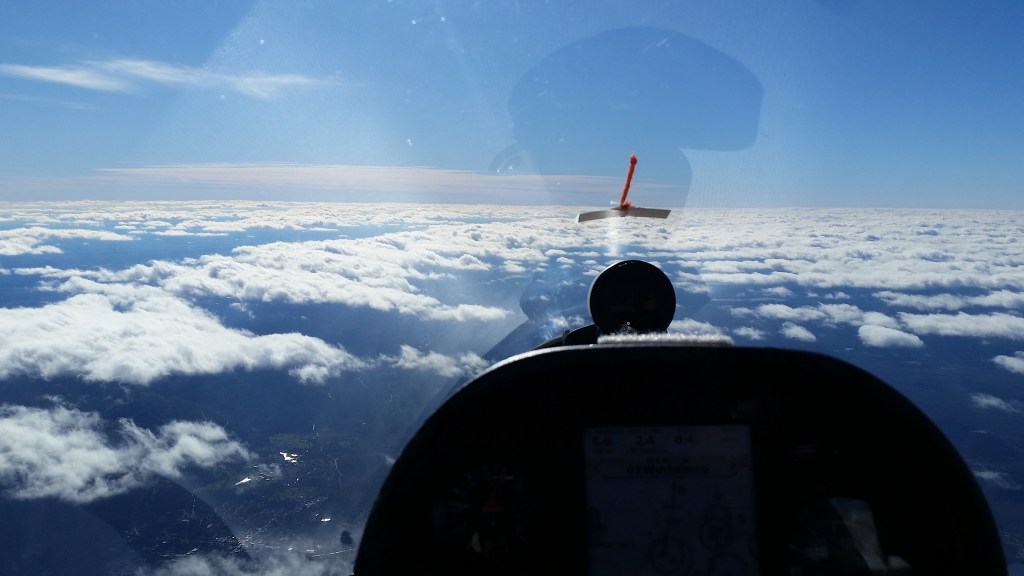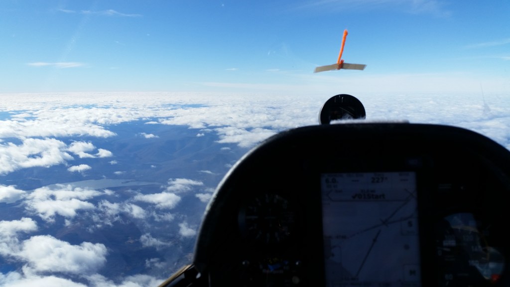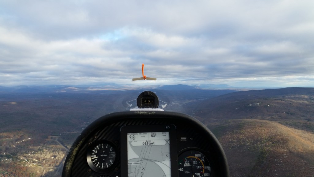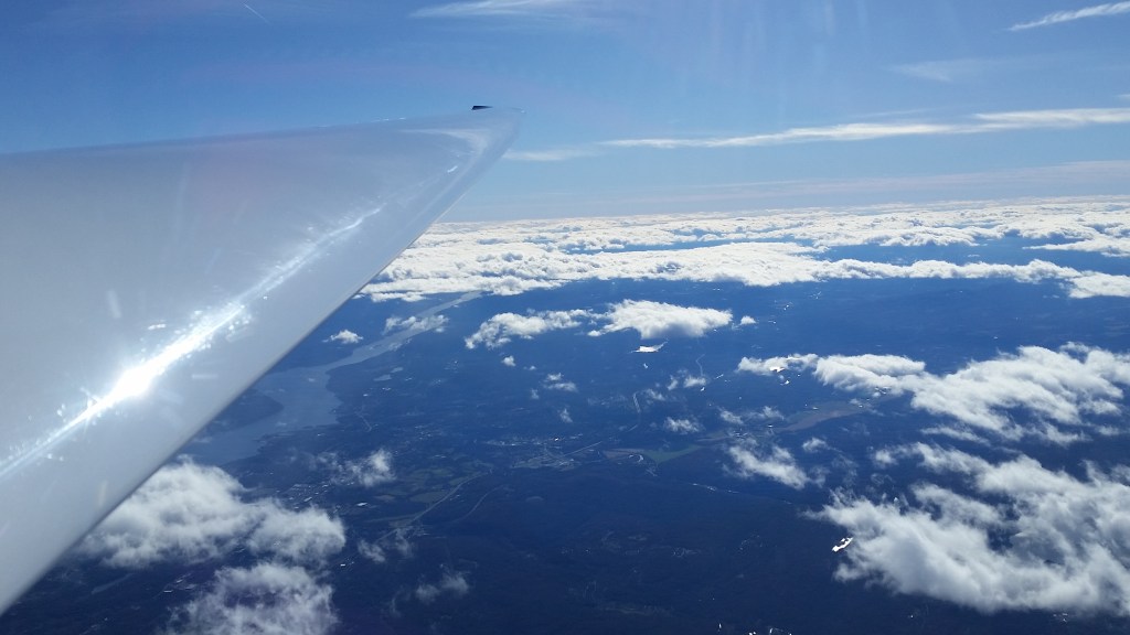 I pushed out at 80 knots and drove toward the primary. Between Wurtsboro and North of Ellenville, it was totally overcast. Going on top of the clouds is certainly an unusual experience in a glider! But looking at the glide angle, I had plenty of height to get to the next hole and I always had the option of pointing downwind toward the ‘Gunk wave. I felt reasonably comfortable.