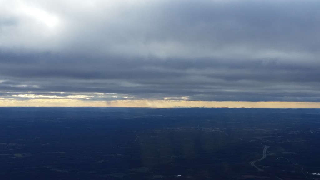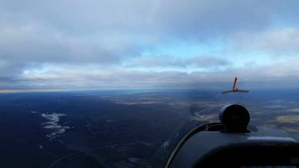 Once I got up there, I found good rotor up to cloudbase (4200ft), but didn’t find a hole. After poking around for a couple minutes, I decided to head back to Wurtsboro where there was a nice big opening in the clouds. Looking downwind of the ridge, there was a good looking wave bar. I figured I could climb up in the little wave by Wurtsboro, drop back to the wave bar downwind of the ‘Gunks and connect with the secondary of the Catskill wave.