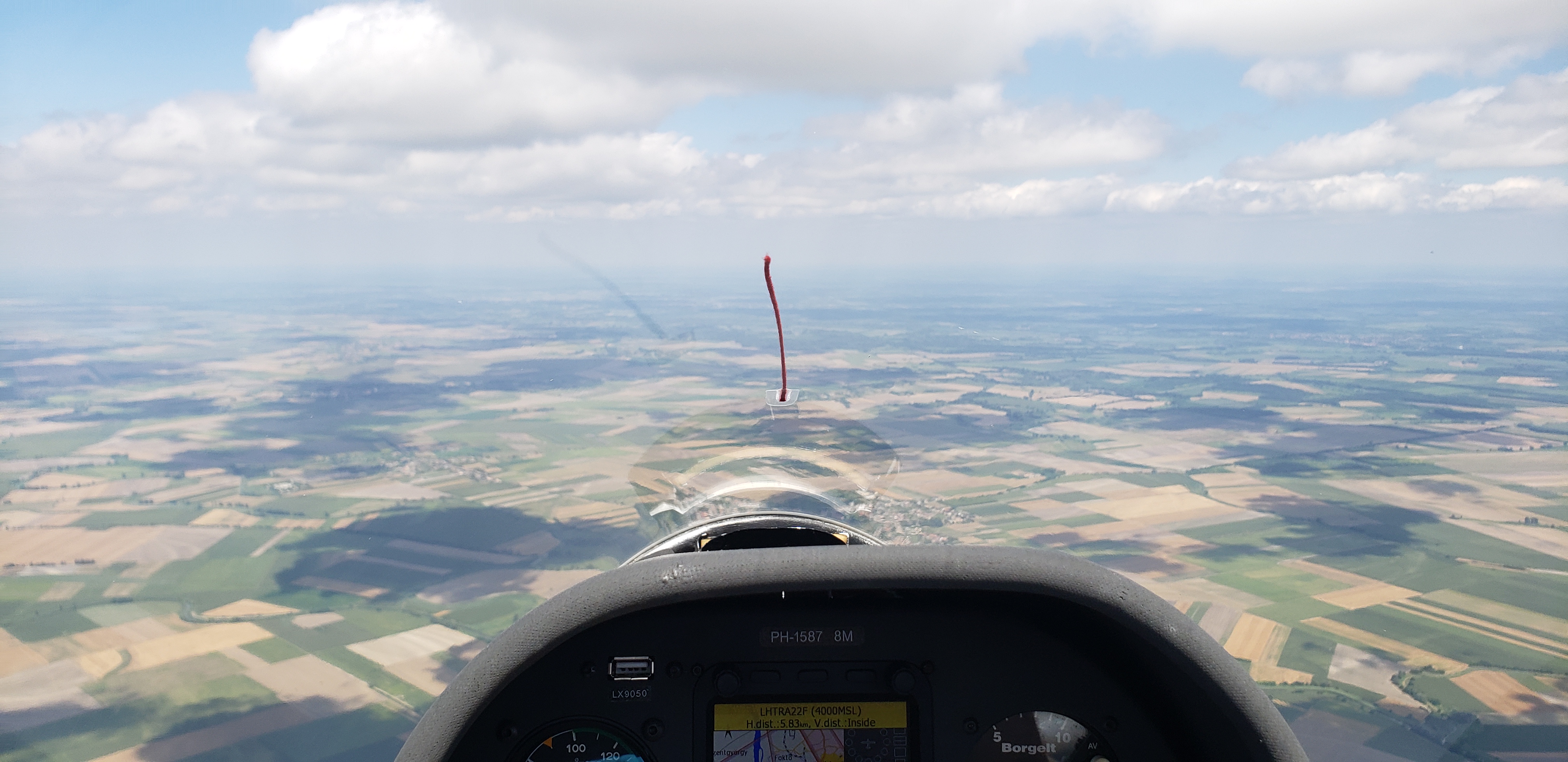 As we approached the turn area, we saw the Danube river valley open up before us. What a gorgeous sight! The mighty river snaking through a sea of fields and towns. We were warned that the lift in this area can be quite soft and down-shifted accordingly. However, looking ahead we saw a dust devil over a field, right by the river! There has been so little rain for the past several weeks that even the river valley was cooking off good thermals! It worked out well enough that we flew right over the river before making our turn and heading back to the east.