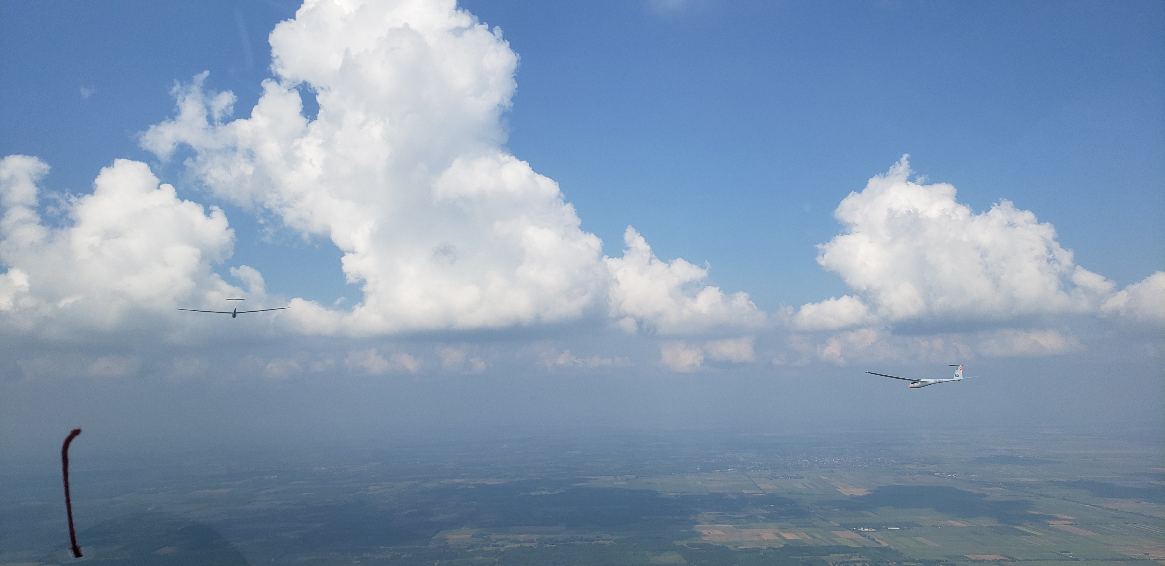 However, the stronger reason to fly as a team is that it greatly minimizes sporting risk. Flying in formation with two gliders side by side samples much more air than a single glider ever could. Your sampling goes from 15 meters and perhaps 10-15 meters that you can “feel” off the wings to 150 meters given a 100 yard spacing between the two ships. The odds of finding a thermal and centering it effectively is much much much greater.