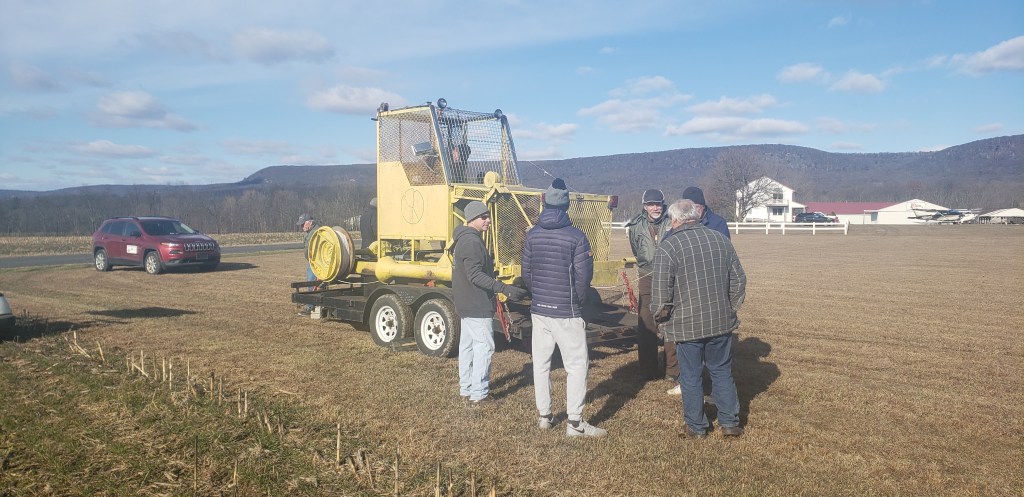 The event was a massive undertaking, involving a large and motivated crew. On Friday, Pete Ayers and Tommy came out to prepare the towplane and the Cow for its long aerotow to Grimes. They cleaned off all the snow and ice on the 2-33 so it didn’t have to thaw in the morning before its journey. On Saturday morning, Philip and Luke DuPlessis volunteered to do the long cross-country tow. To deal with the frigid temperatures and drafty cockpit, they were instructed to wear clothing fit for an arctic expedition! Tommy and Sebastian towed in the club’s Cessna 182 towplane. Jonathan and Gus picked up the canopy covers and tiedown kit and followed the Cow to Grimes in their Aeronca Champ.