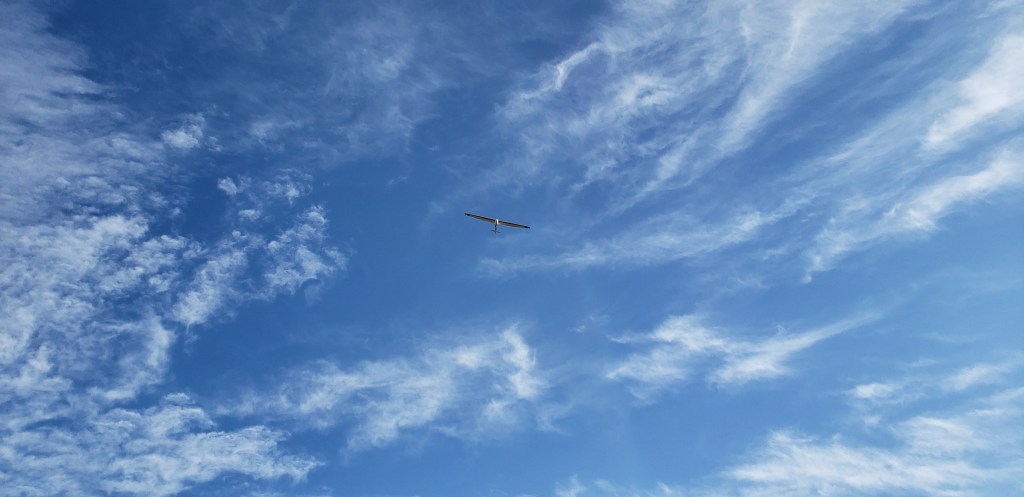 It was quickly apparent that we were going too fast, approaching 80 mph on the dial. Dave kept the angle flat rather than rotating to minimize the load on the wings. After getting to only 250ft, Dave released and said, here you go! I did a quick 180 and landed back where we took off.