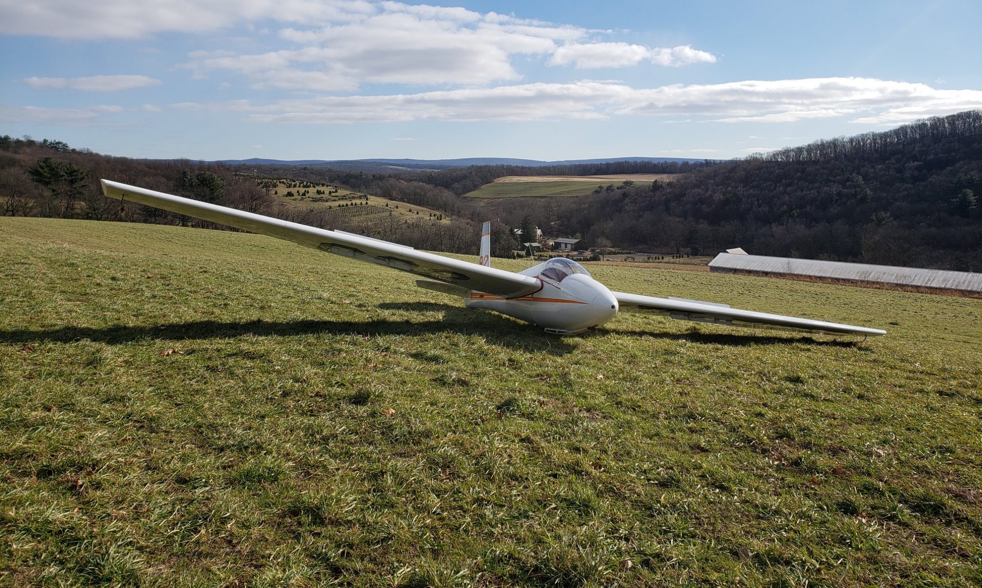 I arrived early in the morning to help Steve assemble ACA, the club’s LS4. It was to be his second flight in the glider and he was eager to take it up on the ridge to get a taste of high performance soaring. I scrutinized the wind sock after taking the trailer out of the hangar; the wind slightly favored launching on 7. Steve and I bantered back and forth on the merits of either runway and Steve noted that the sock went limp. Expecting to depart from 25, we brought the trailer to the very end of the runway.