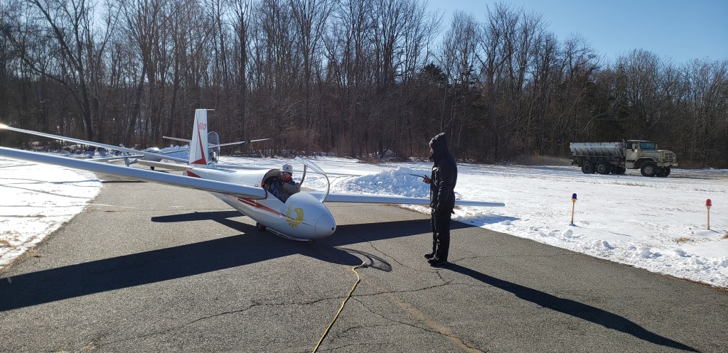 Rather than launching off the snow, we took advantage of the quiet airport to launch on the blacktop. We gridded on the taxiway and positioned the rope at the edge of the runway. Tommy and I worked out the sequence of operations; the glider pilots would push the glider over to the pavement, hook up and go. When the towplane would return, he would drop the rope to avoid dragging it on the asphalt. At the subsequent launch, the ground crew would hook up both the glider and towplane and promptly send them on their way.