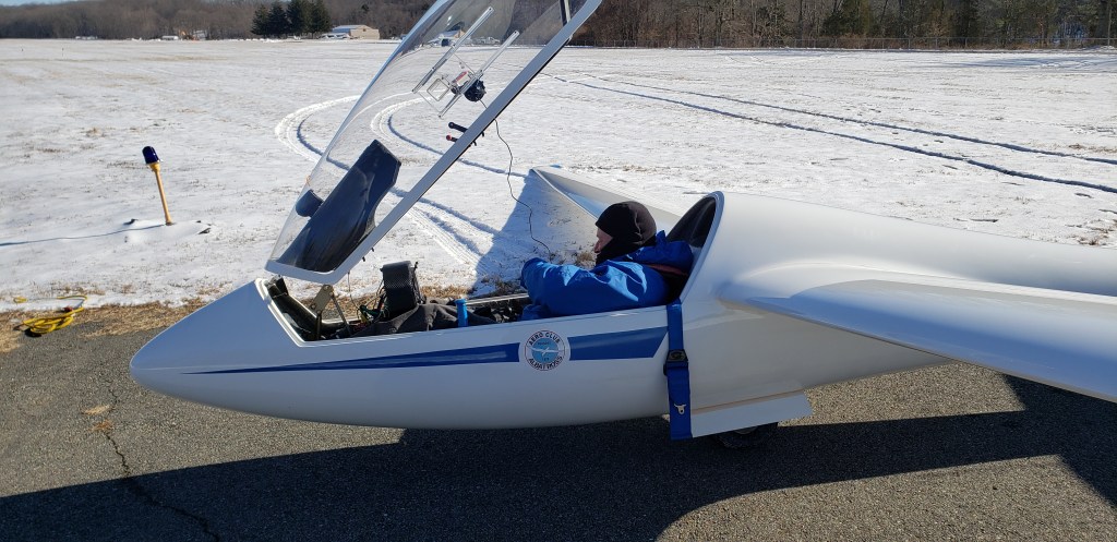 It’s wonderful when holidays align with ridge conditions. Ron Schwartz, Steve Beer, Claudio Abreu, Khanh Nguyen, and I, ACA’s hardiest ridge rats, came out on a frigid Monday to soar. The high for the day was around 25 degrees Fahrenheit, with a temperature aloft of around 17 degrees or so. We looked like abominable snowmen, with layers upon layers of wool, cotton, and polyester. On my account, I had on three layers of thermal shirts and pants, fleece, heavy fleece and my winter flight suit. Electric socks, with the cord snaking to a battery in my breast pocket so I could control the temperature. A ski mask covered my whole head, plus a wool hat and gloves.