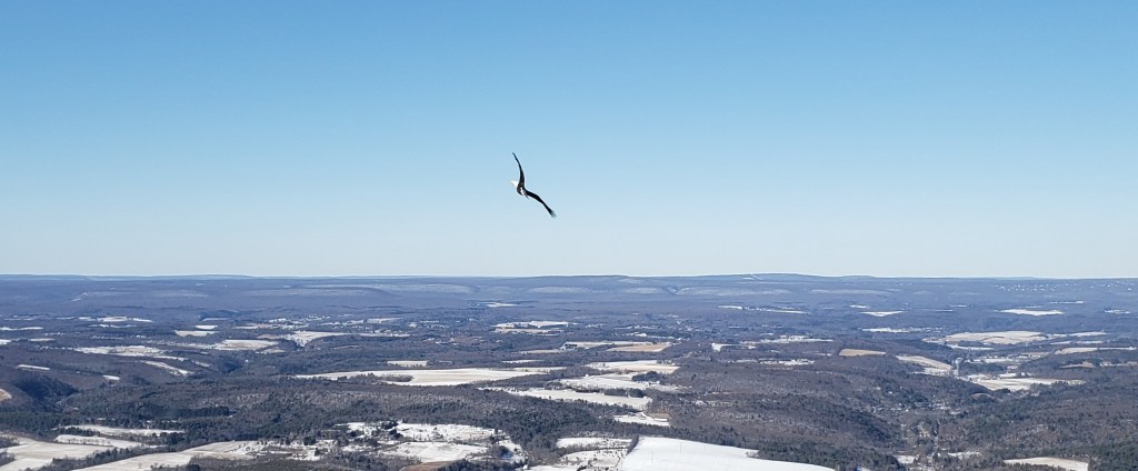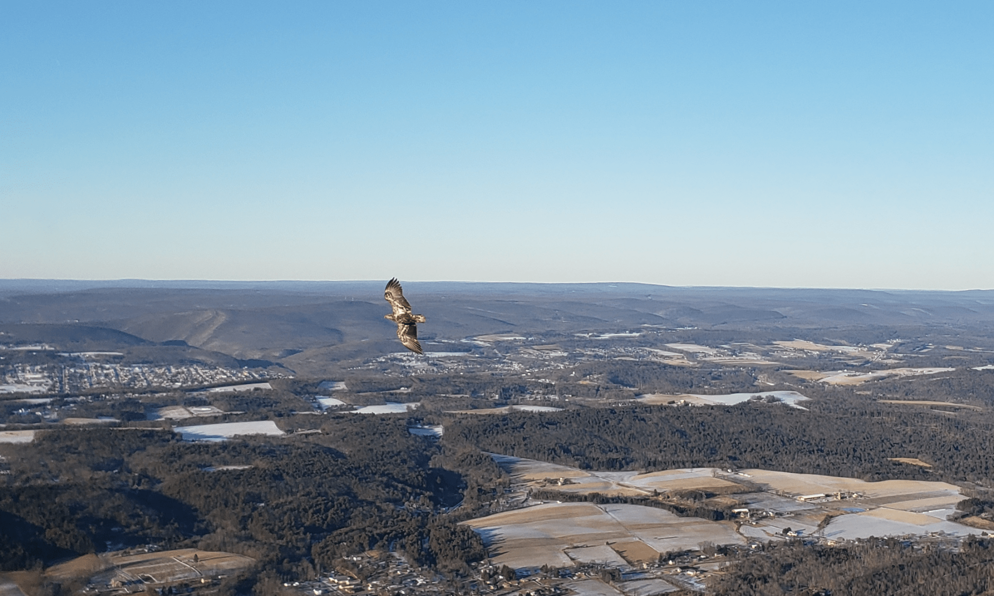I spotted a bald eagle and swung the glider around to fly with him. This guy was moving along at a pretty decent clip, at least 40 mph! It was difficult to stay with him, even with the spoilers fully extended and the flaps down to 20 degrees. To remain in position, I resorted to S-turning, setting myself up for a “bomber run” and then passing near him.