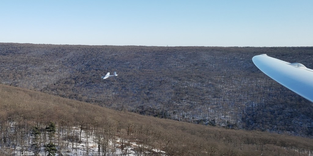 Approaching the Delaware Water Gap, the sun was coming around to the west and lit up the mountain in a gorgeous glow. And there was Schwartz, driving along in his 1-26! That old dog lined up for the foreboding upwind jump only several hundred feet above ridge top. He knows the ridge like an old school London cabby driver knows his city’s streets. He feels the air as a bird, gently swaying to and fro and following the air’s natural ripples, eddies and snaking currents. It was beautiful watching him float across, hardly losing any altitude at all.