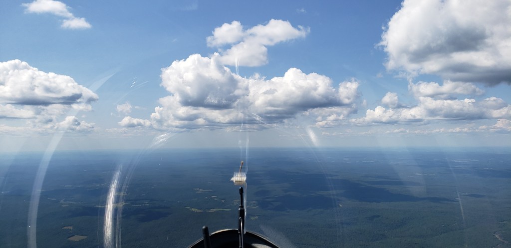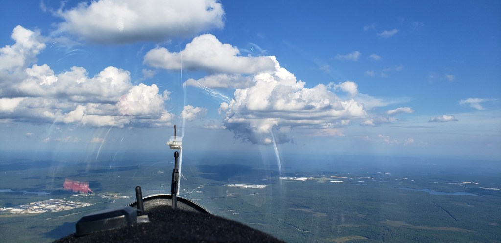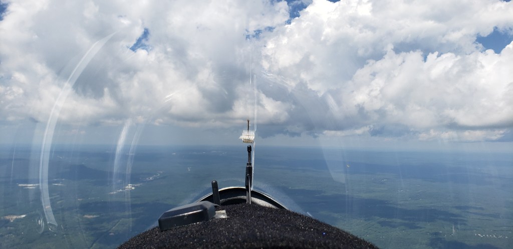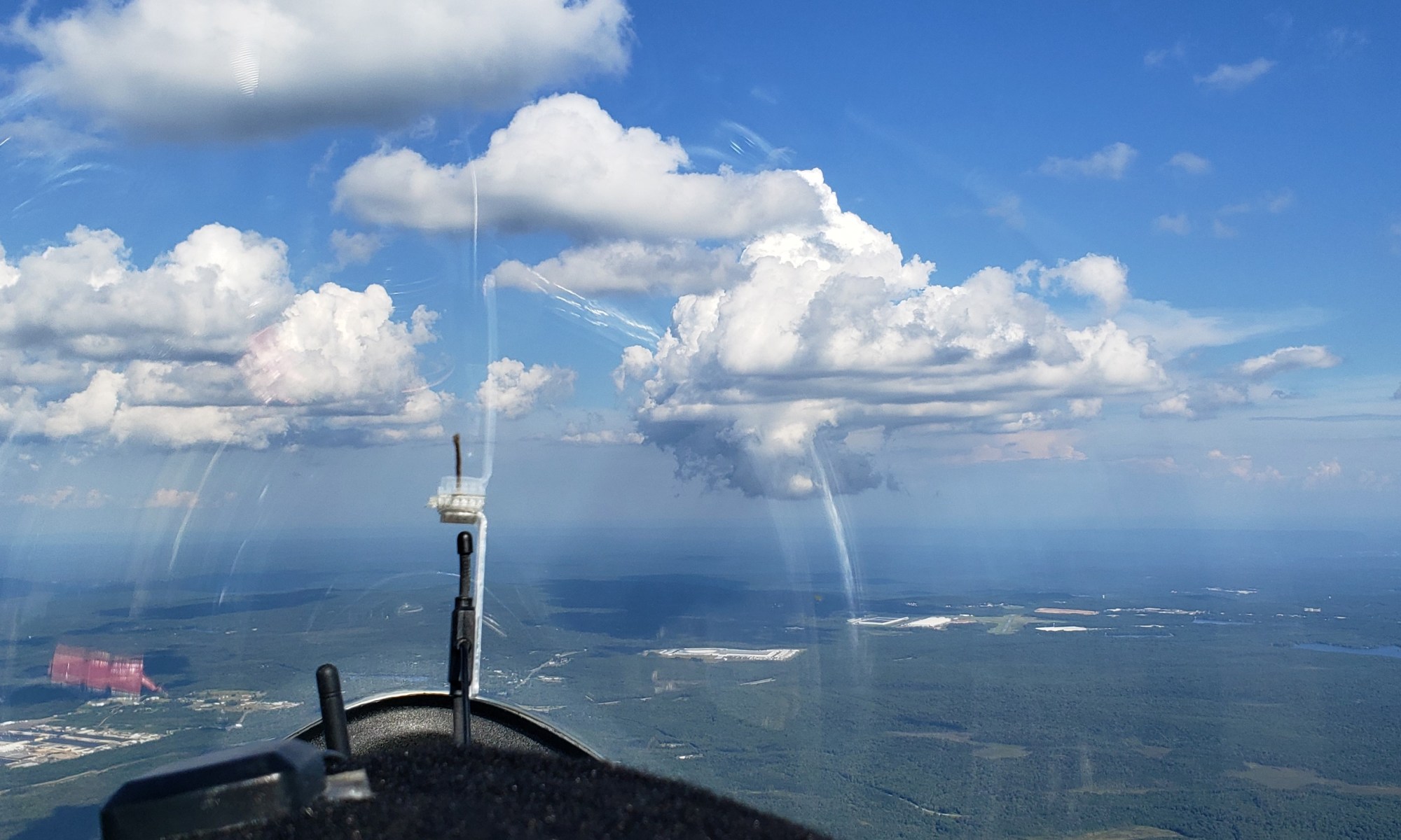 I arrived at the airport with no expectations. It was August; hot and humid with a southwesterly wind pumping in air expended from the swelled up swamps of South Carolina.  My sweat accumulated after assembling the glider, completely soaking my clothes, and refused to evaporate. The few clouds triggering over the ridge were hardly much above ridge top. Having not flown the DuckHawk in a little over a month, I was content to simply get airborne and do a couple takeoffs and landings. And if I managed a short soaring flight, heck that would be an accomplishment.
