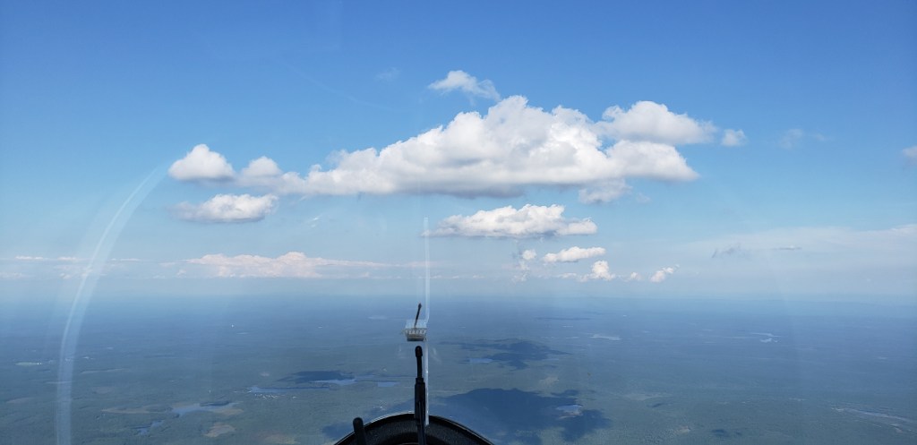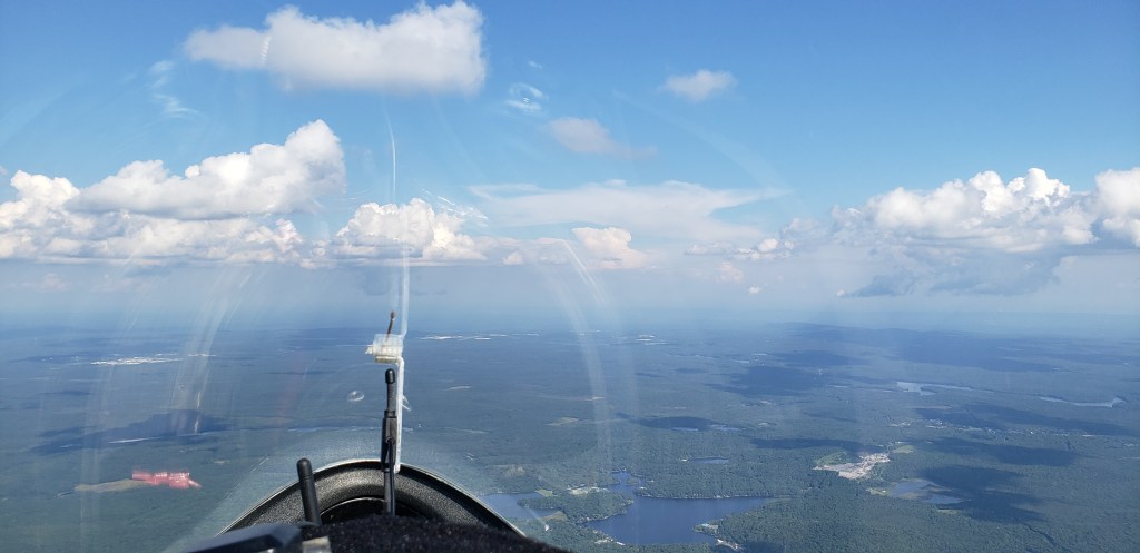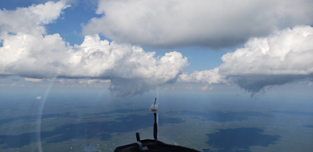 It was so much fun! When the glider sank a bit lower, I’d park my wing in the tendrils and thermalled right up the edge of the cloud. In between the streets, there was some mildly good air serving to extend the glides. This worked very nicely for a lap up and down the line, which was slowly inching its way northwestward. With my watch showing a little past 6pm, it was time to call it a day. After rounding the last cloud, the flight computer showing a MC-3 glide, I turned toward Blairstown Airport, heading into the blue, dead void.