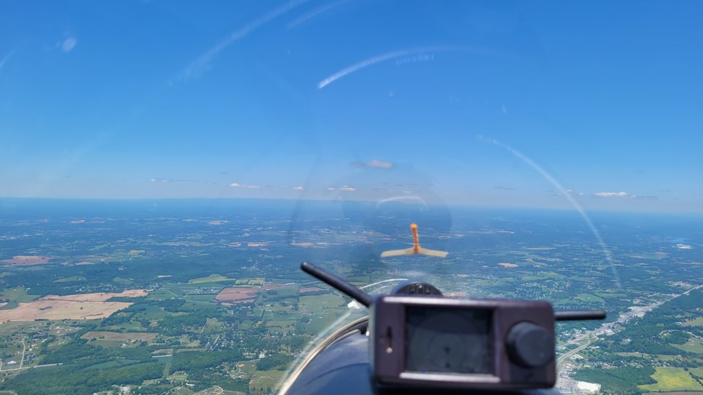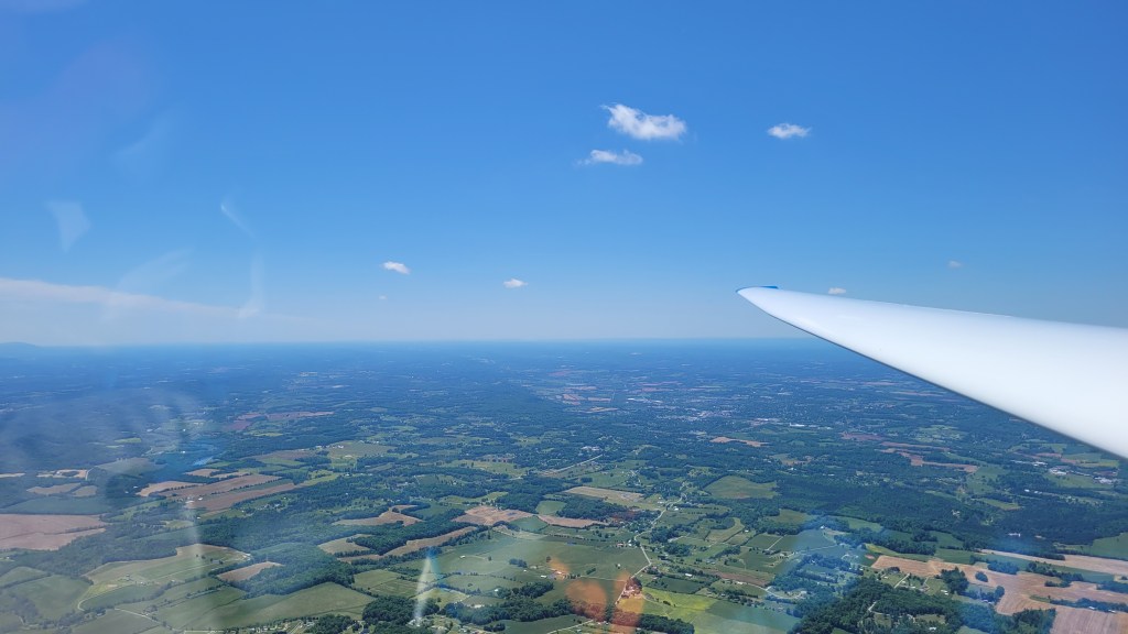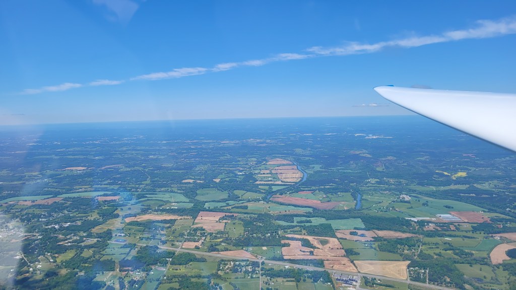 After struggling up to around 4,300ft, I chased after the gaggle hoping to hook a reasonable climb. As I approached the scraps of another thermal they left, I watched my altimeter unwind. Now down to 2,800ft, I absolutely categorically had to find a thermal. The terrain ahead looked marginal, so if this area did not work, I would need to deviate 90 degrees along fields. Considering I was already in a somewhat lifty line, this would near certainly put me in strong sink. As such, I fumbled around in the weak, disjointed bubbles, looking for a reasonable thermal to climb in. This would put me in 5 knots of lift on one side and 3 knots of sink on the other, for a frustrating 1.5 knot average climb. After several minutes of this agony, I hooked into a solid core. This sucker went up to 5-7 knots and I felt both the earth dropping away underneath and my anxieties washing away. Sometime shortly thereafter, Tony Condon joins me with his Standard Cirrus and we shared the climb together up to 6,500ft; the high point of the day.