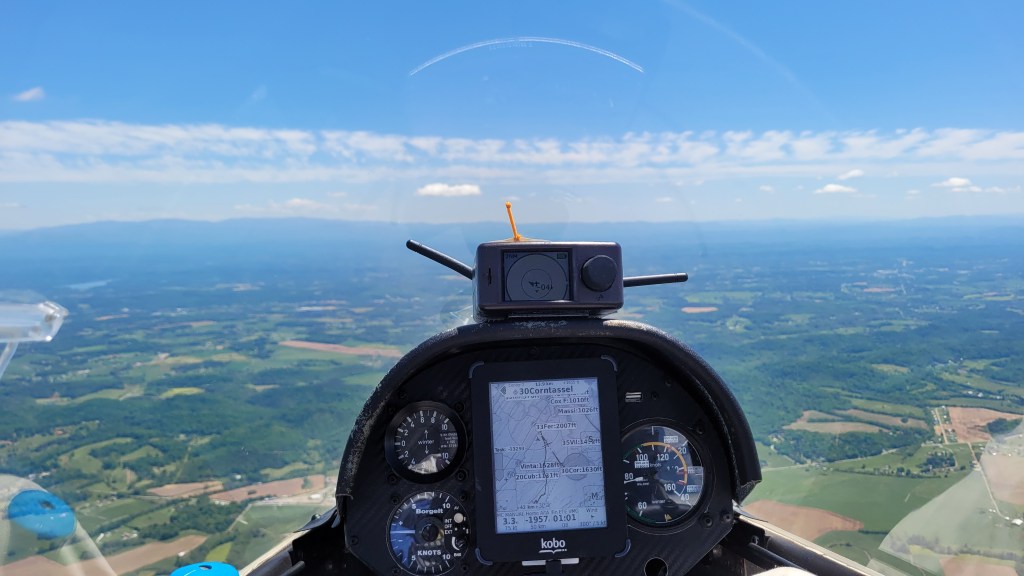 Looking ahead, I couldn’t see the gaggle anymore. There’s nothing that puts out a lust for blood like knowing there is a gaggle ahead that dropped you. I looked over my right shoulder and saw the ridge well below me. It should be little sweat to head the edge of the next sector at the Cleveland Y and then hook back to the ridge and ride the thermals and maybe weak ridge to the steering turn and back home. I figured most would stick with courseline, so this was my chance to hit the gas.