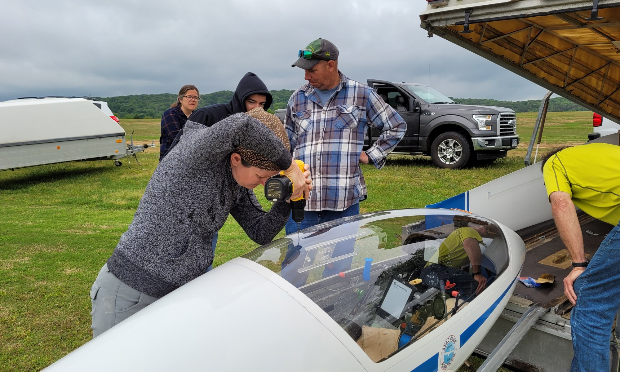 Thankfully, Sarah Arnold, World Champion, airport owner, and licensed mechanic had a full service shop for her equipment in her spacious hangar. She had plexiglass drill bits to contribute to the fix. Mitch Hudson, in turn, had a cordless drill and packing tape to fix the glider right on the spot. I had the CA glue to seal the crack. And Jacob Fairbairn came over to help work on the canopy. All three licensed mechanics inspected and contributed toward fixing the canopy. The field repair will keep the glider flyable for the time being, and I can’t thank them enough for helping make the glider airworthy again. It is absolutely amazing the level of knowledge and experience available at such meets.