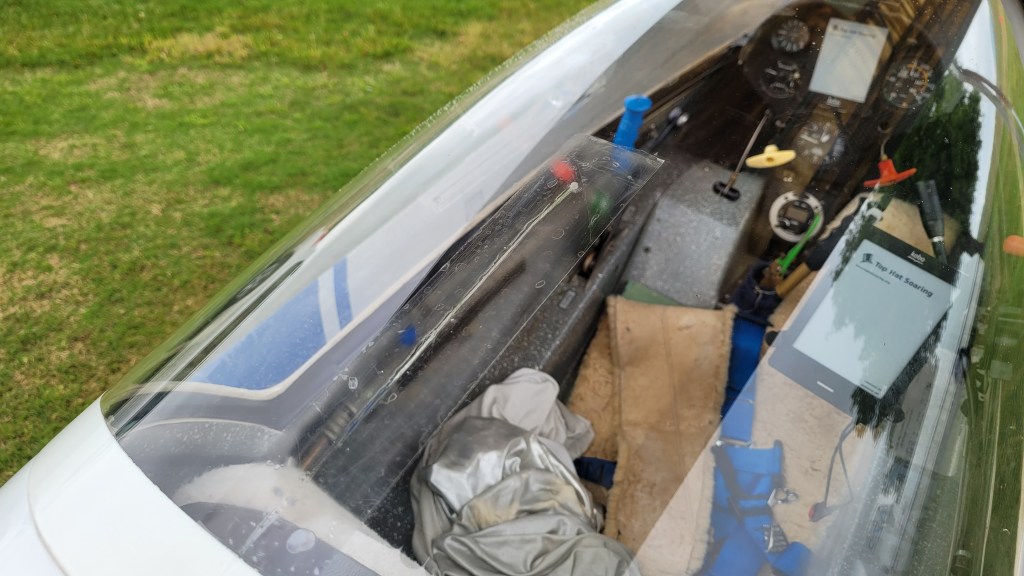 Yesterday I broke the canopy of the glider because I did something very stupid. Today, when I inspected the glider, I found the crack at the top of the canopy. Thanks to the help of Sarah Arnold, Jacob Fairbairn, and Mitch Hudson (all IAs), we have temporarily fixed the crack, which makes the glider flyable for the time being. I am very, very sorry to my club for damaging the glider and will work to make it right. When I get back home after the end of the meet, I’ll coordinate with the club to make sure the ship remains safe and flyable for the remainder of the season and replacing the canopy at the end of the year.