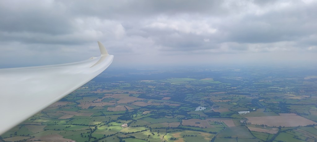 Looking ahead, there were a couple sunny patches on the ground. The clouds were a solid overcast, so the sky was no longer helpful. There were a couple burbly points, but no clear bubble to climb in. I got lower and lower, finally down to 650 meters. This last large sunny spot ahead was the final area to try; otherwise I was out of energy and ideas. With my field picked out, I floated on ahead and kabang! After a couple centering turns, I went from 300 meters above the ground to rocketing up and away in 2 m/s. The variometer screamed and the glide churned its way all the way up to cloudbase at 1,450 meters, for a 1 m/s final glide back home.