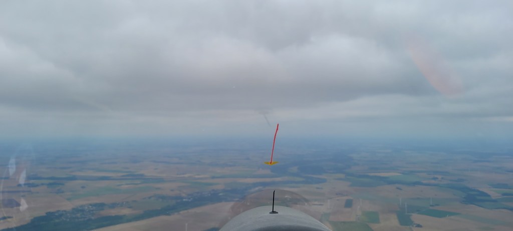 Down at 550 meters, I connected with weak lift and slowly drifted back. But then I felt bubbly air as the thermal cycled in. 1.5 m/s! And with that, I watched the ground drop away under my wing as I circled up, up, and away. At cloudbase at 1,300 meters, we were back in business. Further, the conditions on the north side of the task area cycled in as the thick clouds thinned just enough for enough sun to hit the ground. JP unfortunately was still stuck in the muck, slowly working his way up. At this point our days completely diverged.