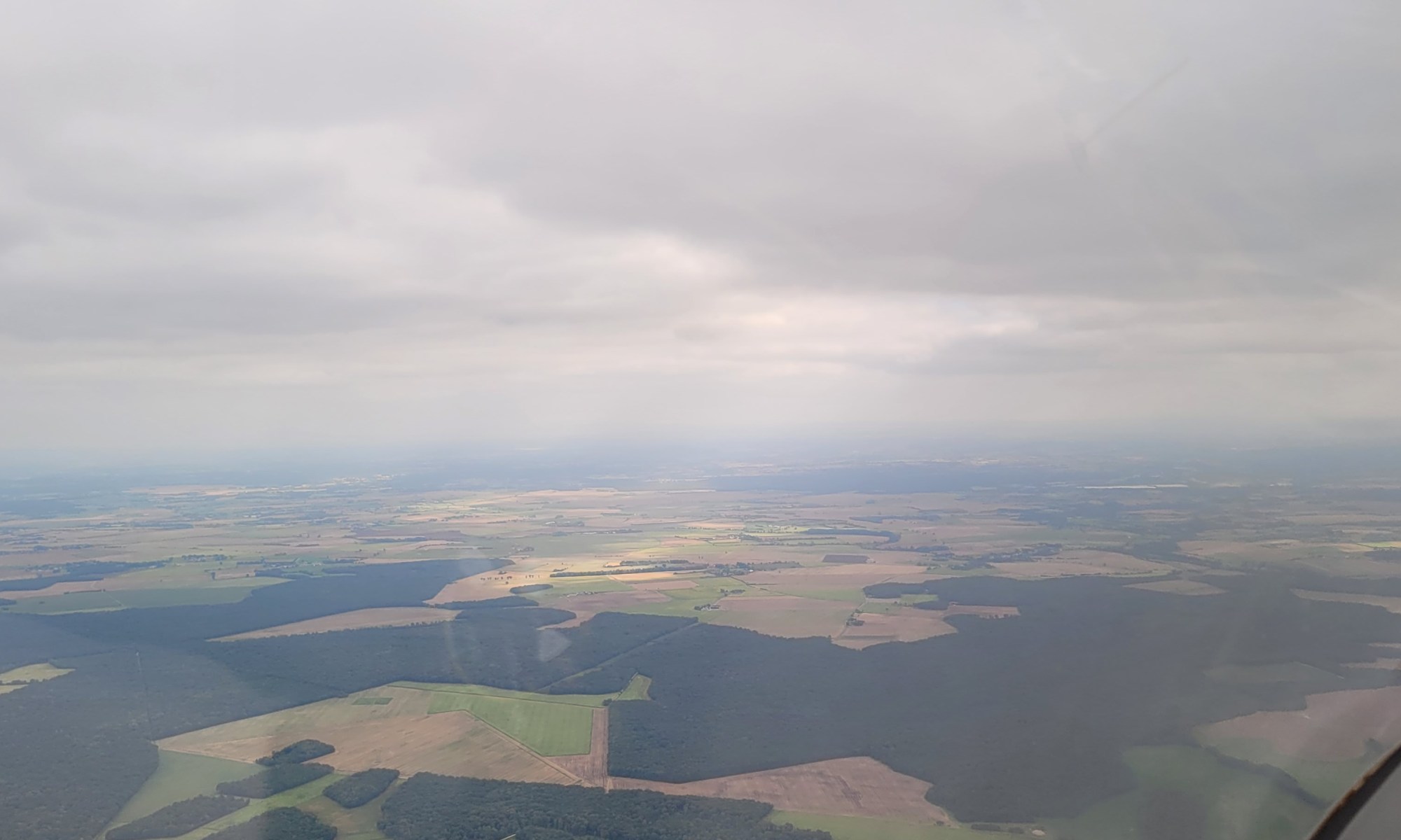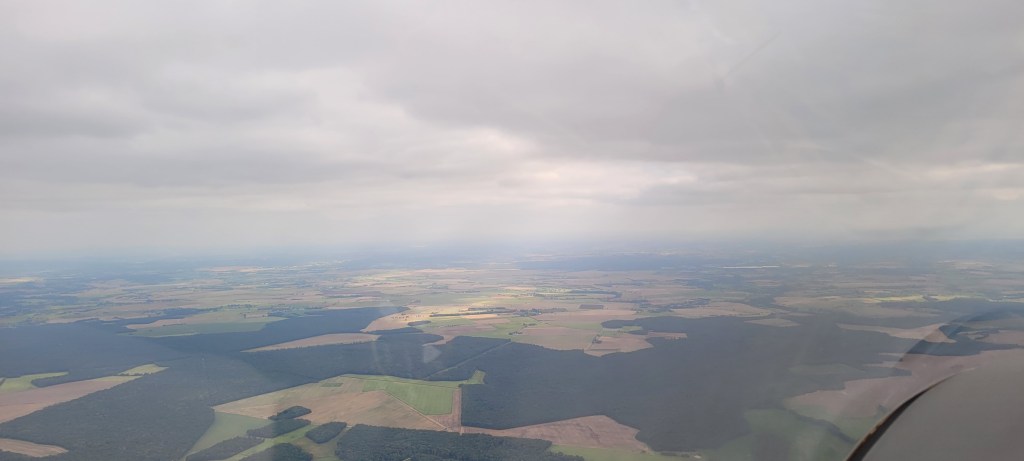 This climb only took me up to 850 meters and I rolled out, heading on a downwind track to some better looking clouds. However, despite the overcast, I found several 1-1.5 m/s climbs that I took for every ounce of lift. As I headed southbound, despite the lift being far apart, the air still felt solid to me. Another solid climb over the edge of a forest in a little sunny hole took me up to 1,200 meters or so and on the next glide I came across Thies (IV), the fellow I had been chasing for the better part of the last hour. He was parked in a zero climb, I took a turn with him and left. He left as well, though took a different path.