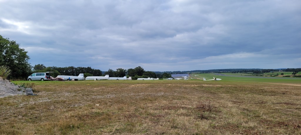 As we were climbing, we looked down and noticed that the launch had stopped. Colin told us that Standard and 15m were changing to their “B” tasks. With that, we had the joy of flying the longest task of the day (264km) into some of the trickier forecasted weather, with the lowest performing gliders. The whole class knew their fate was bleak, looking ahead at a nearly completely overcast sky. Nonetheless, we converged as a gaggle near the start line.