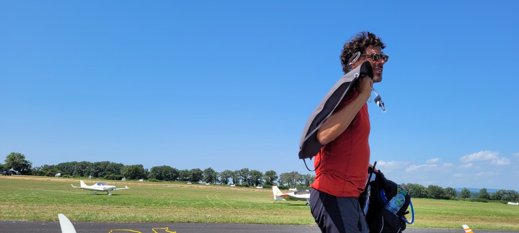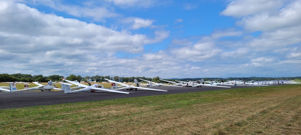 Despite Mitch’s beaming confidence, we all retreated and lingered around the airport like bums. Though around noon, the overcast burned off and the sun started hitting the ground. The northerly wind ripped through, slowly drying out the soaked earth. Gliders started to emerge from their boxes, and covers started coming off. By 2pm we were all gridded up on the south end of the runway.