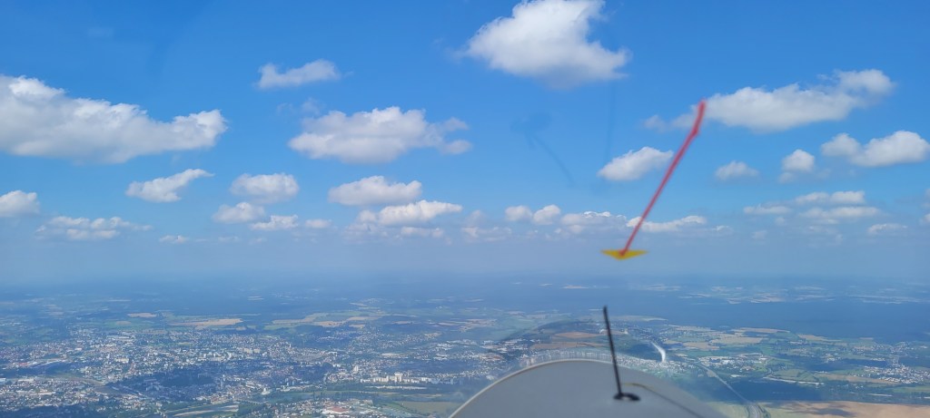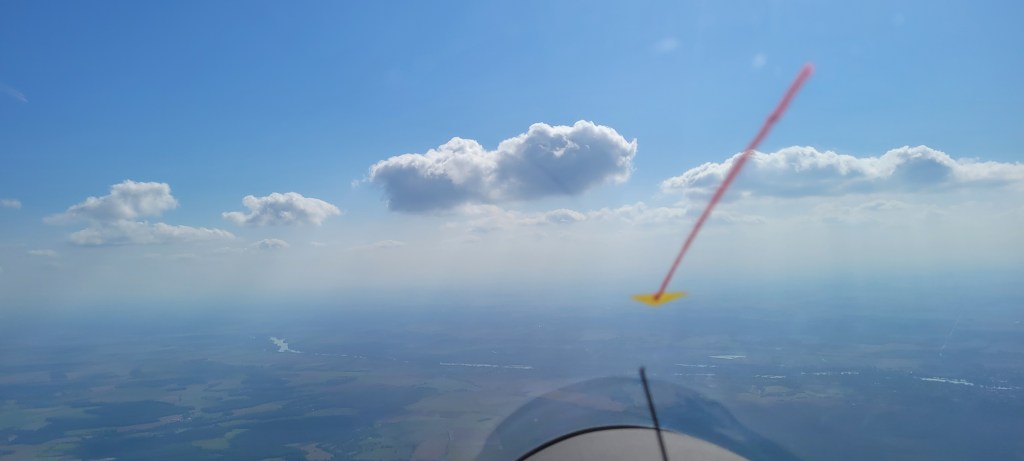 The next glide took us to the turn and near the airport toward several wisps. We were alone again, looking for the main climb that will anchor our final legs and most of the final glide. Unfortunately, the lifty area was very weak, and we largely floundered in half a knot, though ahead looked even worse. If nothing else, the group behind us will catch up and help us out later.