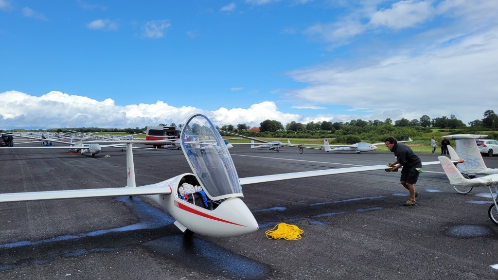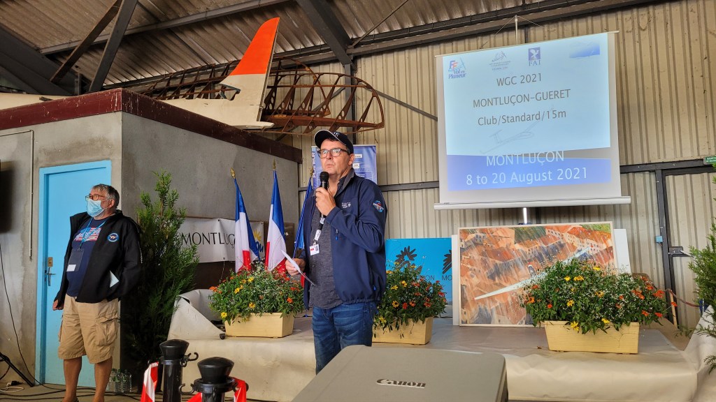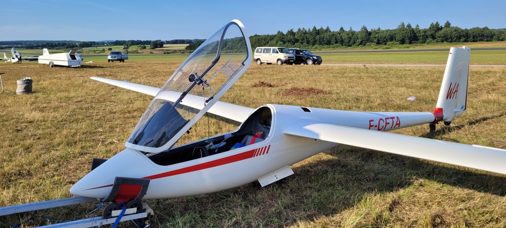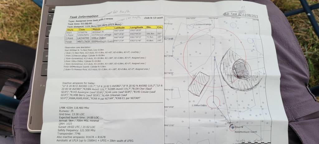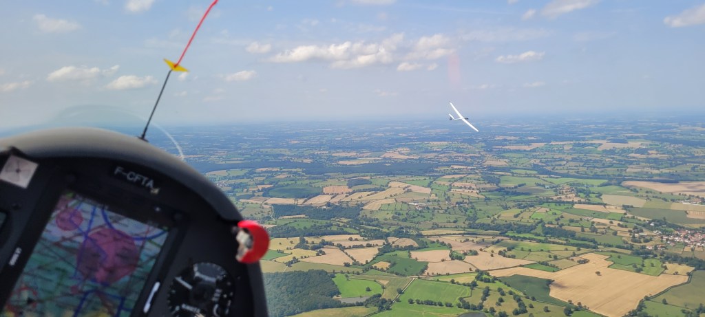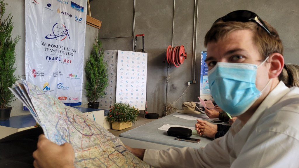 Greetings from Montlucon! Talk about a day with surprising weather. In the morning, there was a solid overcast layer and a hazy mist down low from the recent rain. If there was a day that screamed “not-flyable”, this was it. So we can be forgiven for being skeptical when Aude and Walt suggested a reasonable boundary layer in the afternoon, with cumulus clouds and decent soaring conditions. We kept our minds open, but weren’t exactly optimistic either. Especially frustrated were the Standard Class, who were first in line to go fly today on a pretty long task into the weaker part of the task area. Sarah pleaded, “What have we done wrong to deserve this?” Rumors were that they renamed the Standard into the Satanic Class. In the end, all but Tom Holloran (MY) on the US Team made it around on a pretty decent soaring day, though JP and I felt we could have done a lot better if we had avoided some rookie mistakes.