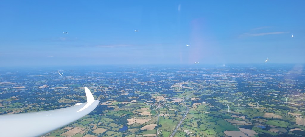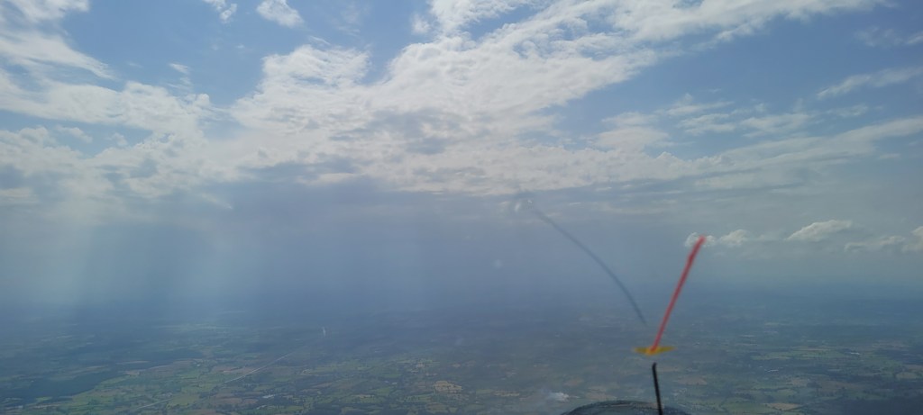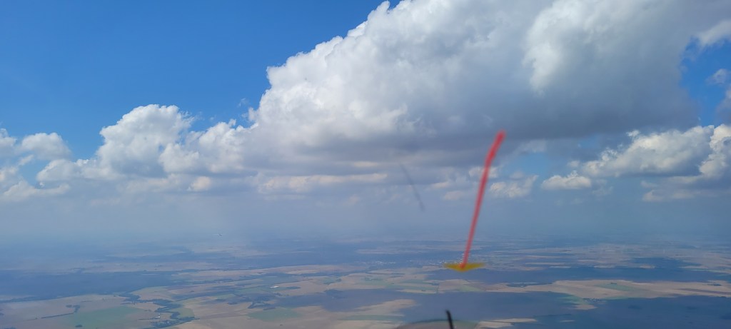 Still not having learned my lesson, I drove hard to the south, getting lower and lower as the clouds decayed in the later afternoon sky. JP and I were hopelessly split now as he took the western line about 6 miles away and I was on the eastern edge of the second turn sector. I saw gliders ahead under reasonably defined clouds and braced for my next climb. My first thermal was weak, about 1 m/s. I hung for a bit and as it started petering out, I figured the next clouds over a little forest should work better. I drove out, got down to about 250 meters AGL, hunted around for a while, and finally connected with a solid 1.5 m/s after some flailing and struggling. One more climb closer to the airport and I got home.
