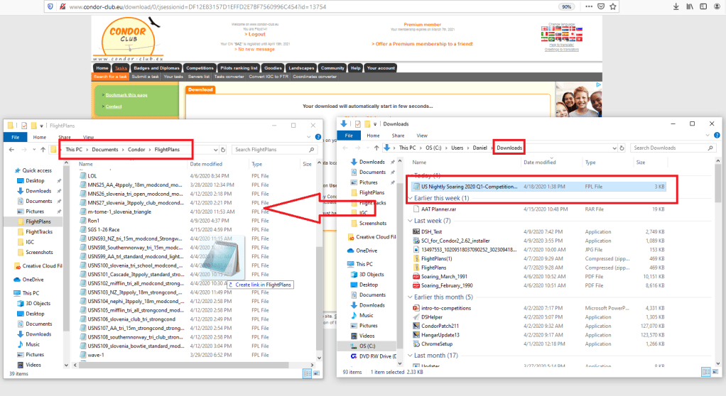 Select a task and practice off-line. Here are several examples: one, two, three. On the “task description” tab, click “download it now”. Place the flight plan into your “FlightPlan” folder. To race against the flight tracks of other competitors, download their FTR file under “Race Results”. Place the FTR file into the “Flighttracks” folder. Open up Condor and select the flight plan. Under NOTAMs you can then select the “Ghosts” you would like to fly with.