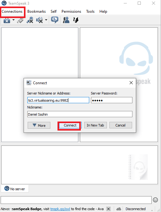 After downloading Teamspeak. Click Connections. Select “Connect”. The box will appear above. Type in ts3.virtualsoaring.eu:9982 for the address. Password is ask13. Press “Connect”.