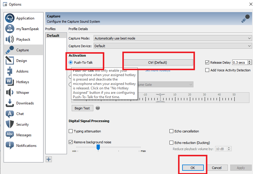 Set up Push-to-talk for your microphone. Go to “Tools” and “Options”. Go down to “Capture” and select the Push-to-talk option. Select a hotkey to activate. I use the Left CTRL key on my keyboard. Click OK.