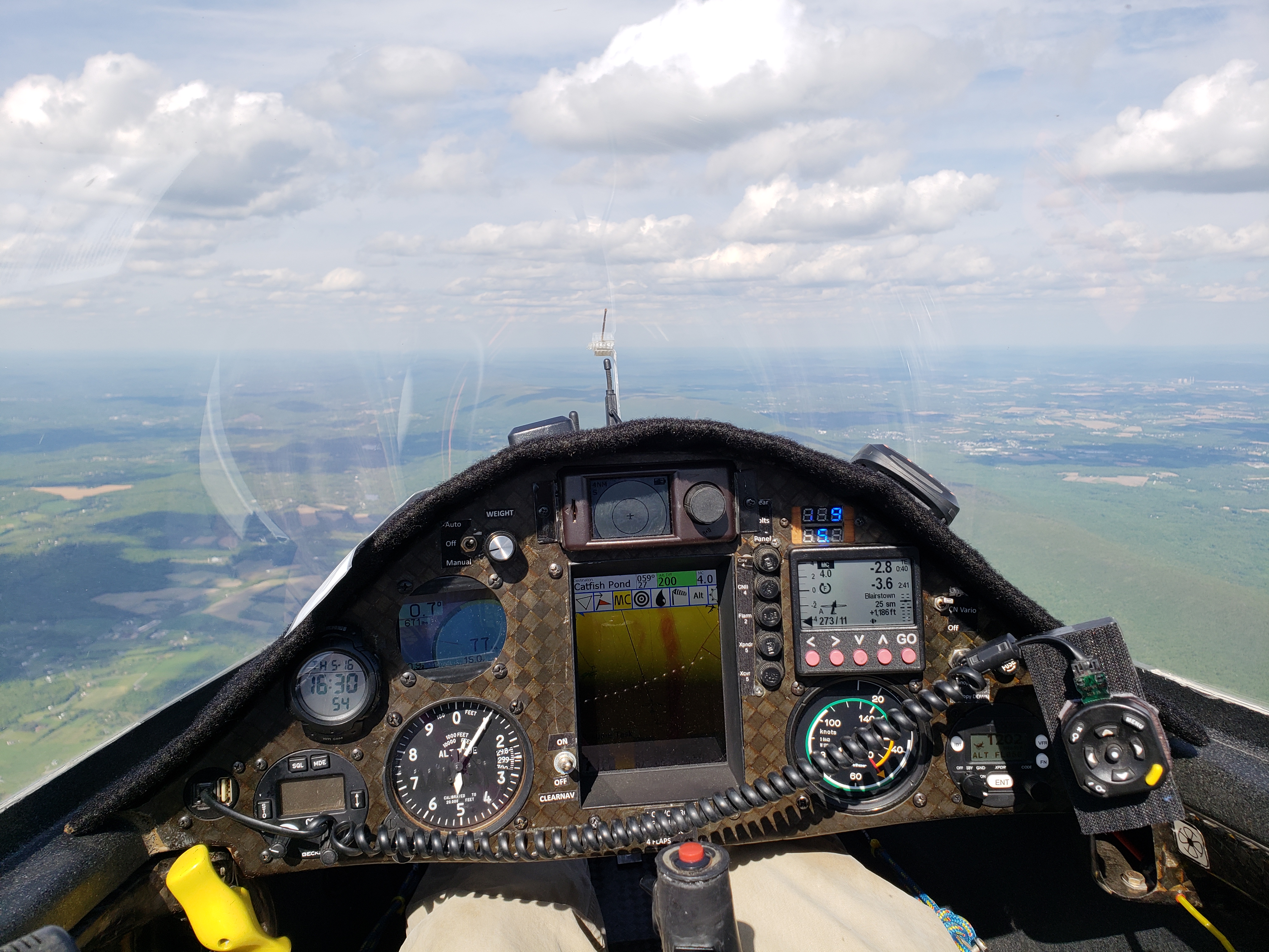 Once on the front ridge, I headed for my turnpoint near the edge of the Williamsport Class Delta. It was now an all-out drag race. Abeam of Lockhaven, I figured that I had now started a 900km out and return. It was 1pm and sunset was 8:45pm. Figuring seven hours was a reasonable bet, I had to make Covington by 4:30pm to have a little reserve at the end of the day. Every knot of airspeed counted now; every minute earlier would mean that the thermals are that much better on the run back.