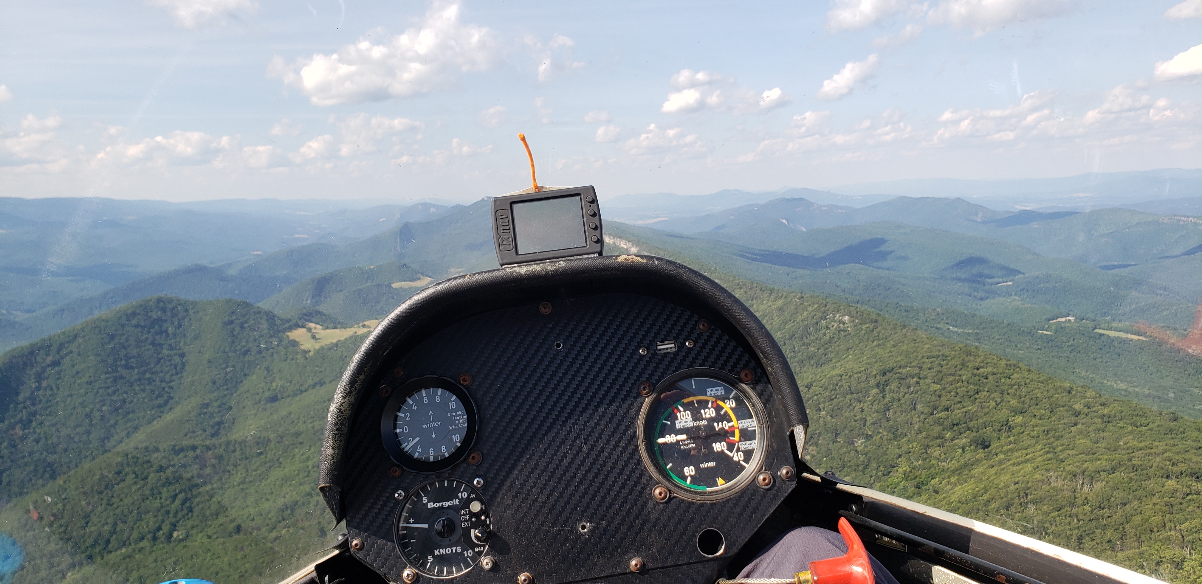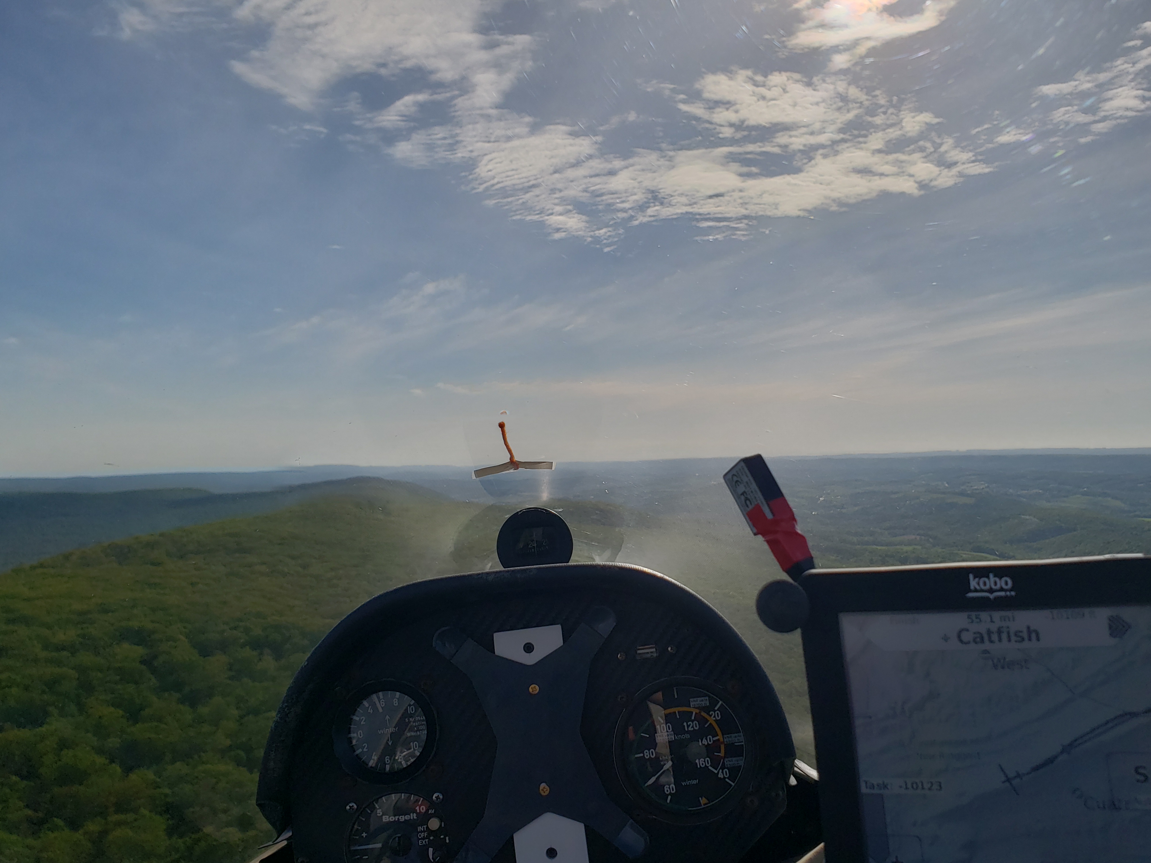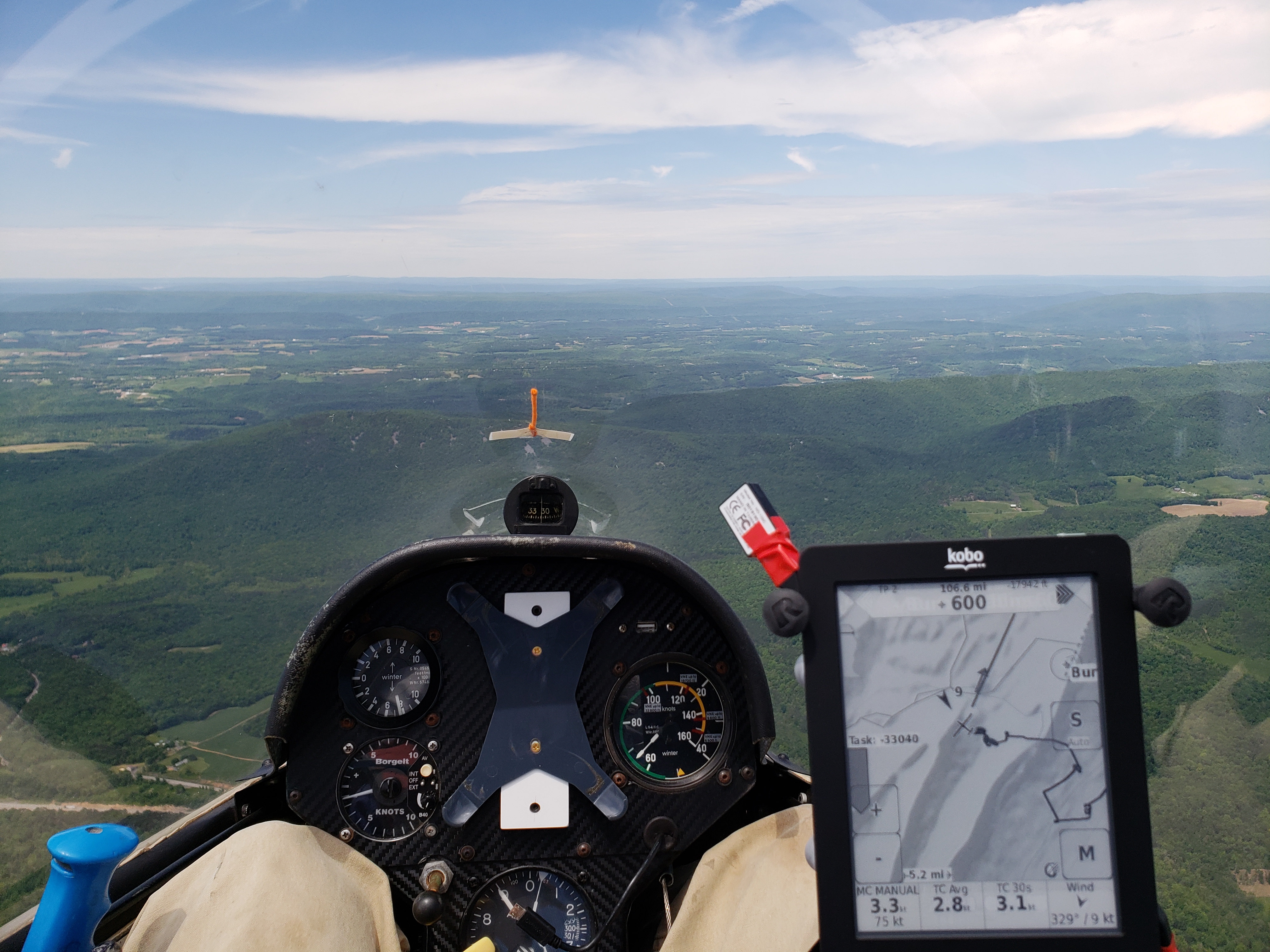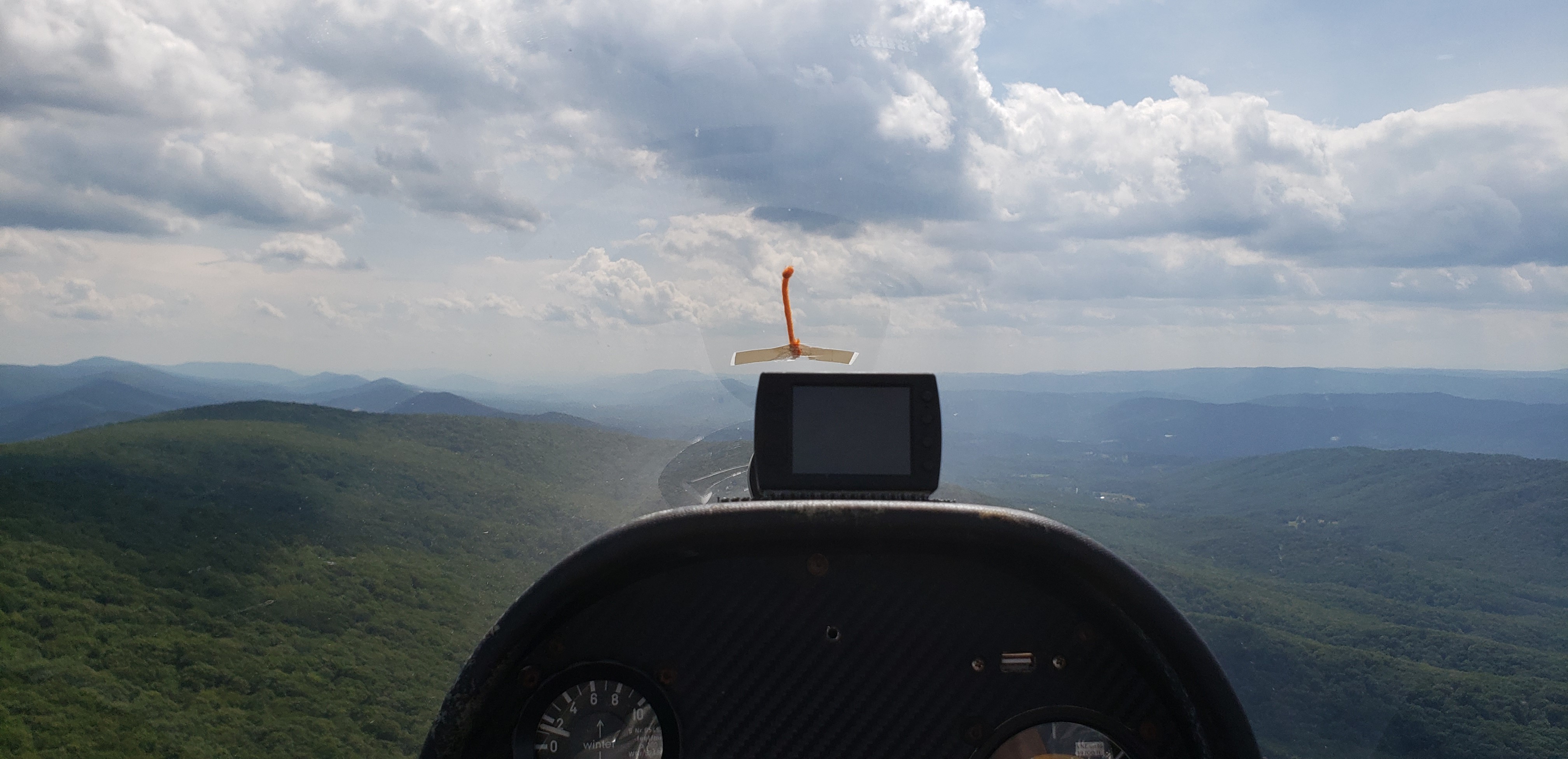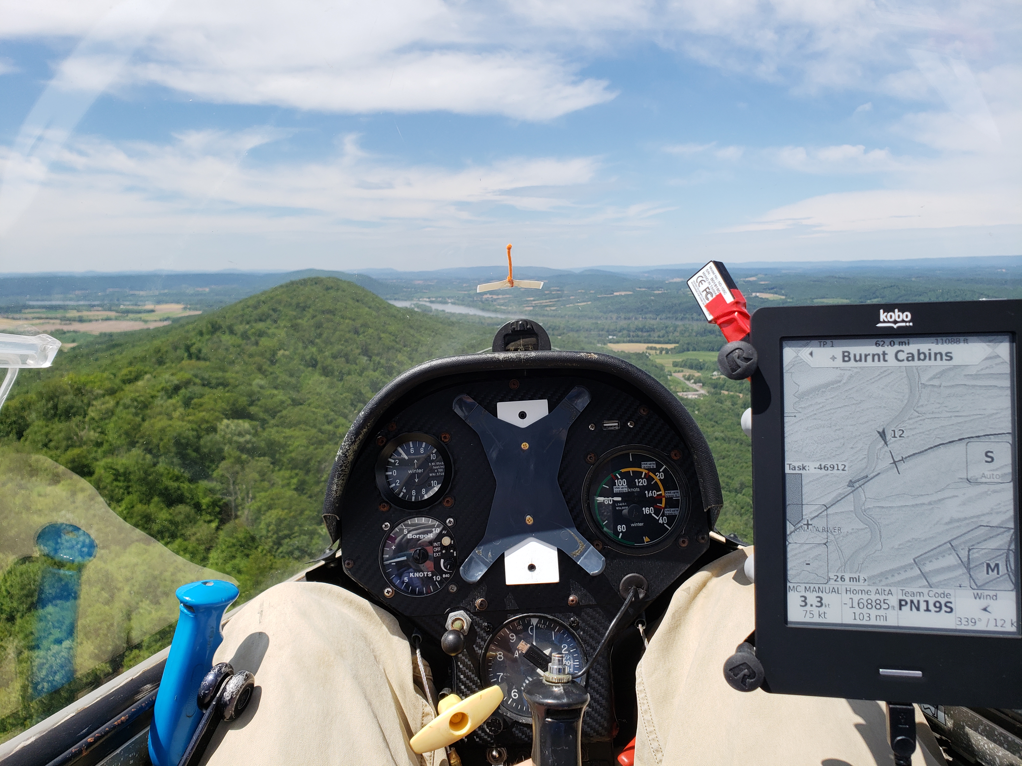 No real trouble making it down to the turnpoint at the tip of Evitts, though the ridge was a bit weaker than forecast. I was hoping to do 110 knots on the good sections thanks to the addition of all the ballast. But instead the ship was doing quite a bit of 95 knots, sometimes even 80 on the uphill parts. The ridge band seemed to be cut off 300ft or so above ridge top, which made the transitions a bit trickier. This made my life difficult crossing to Nittany on the following leg. I had to abandon the transition and pick up a thermal in the middle which finally got me across. Similarly, this made it tricky to get across the “death dive” to the front ridge. I like to float up several hundred feet above Nittany before going across, but the ridge gave just enough to clear over the top and go. Tricky business.