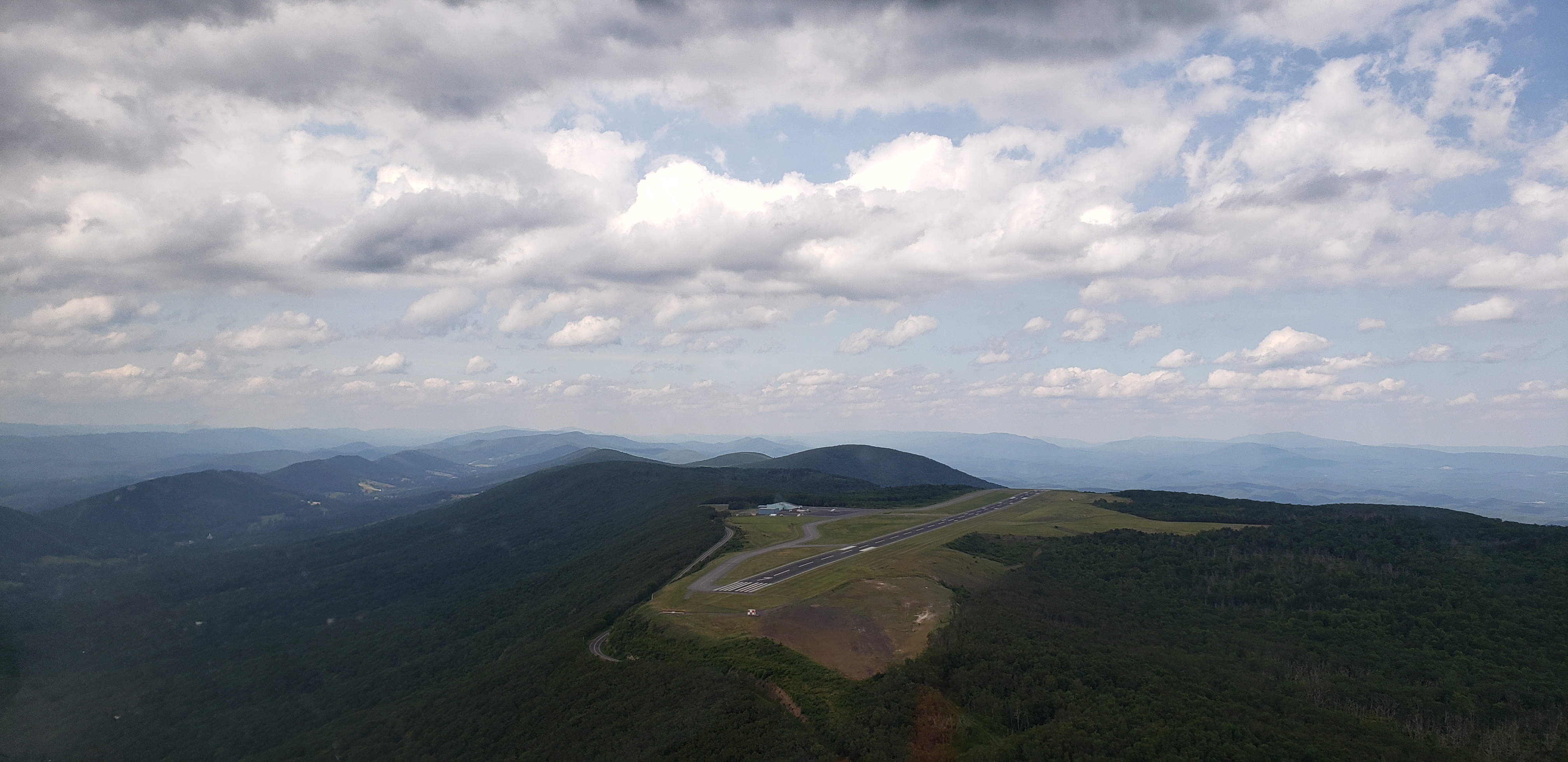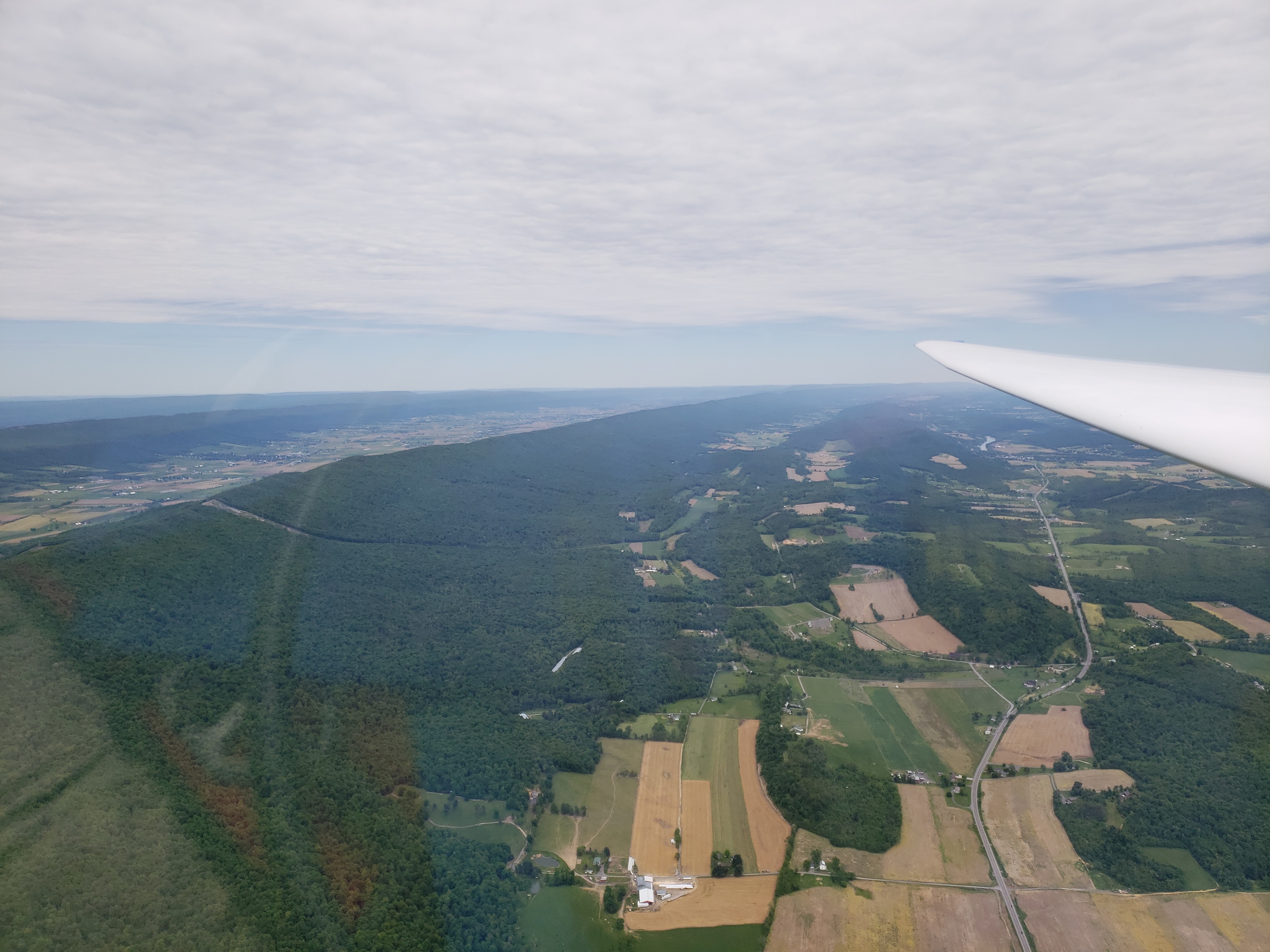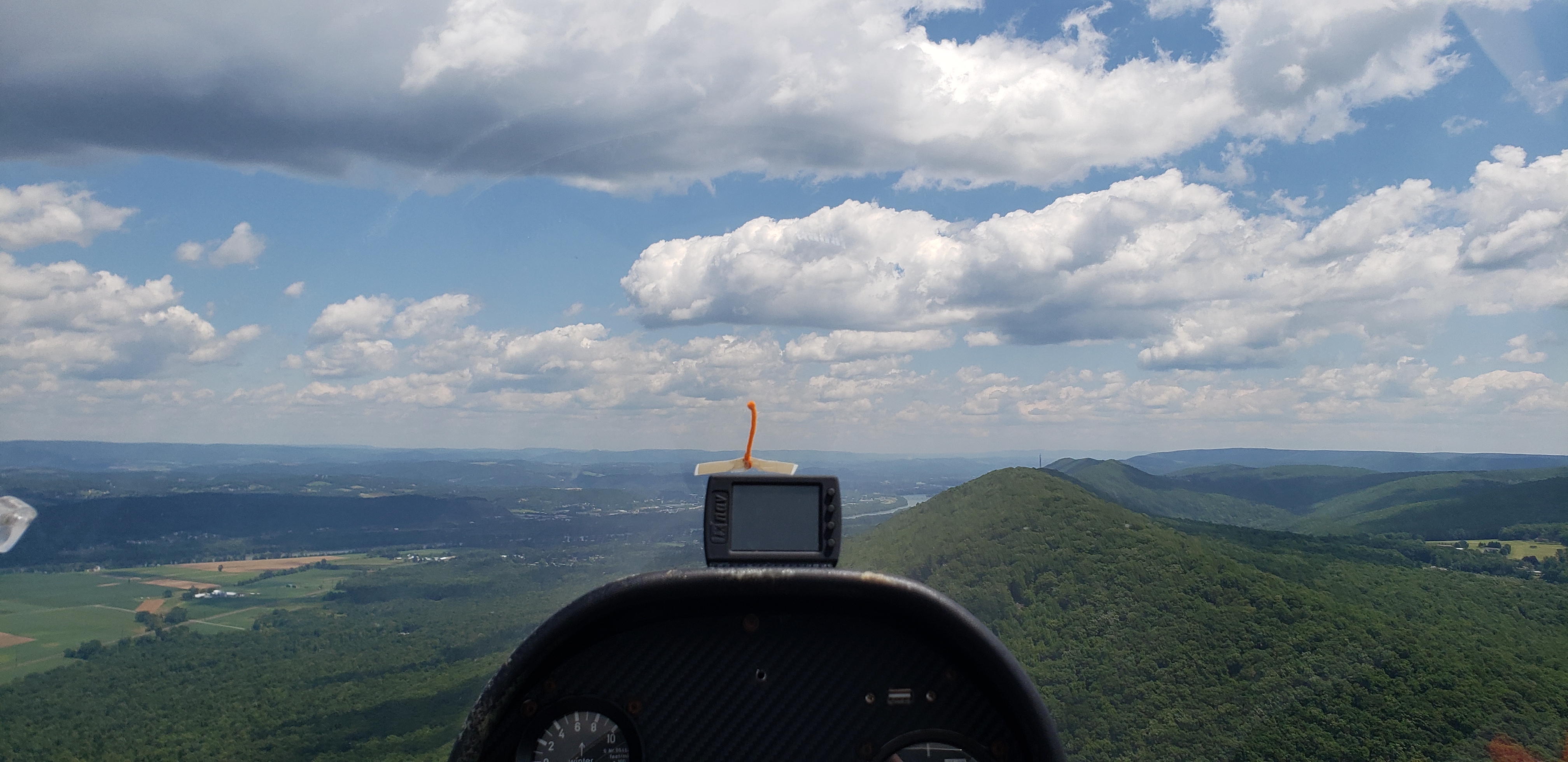 Altoona and Bedford went by without too much difficulty and I was on the Knobblies before I knew it. The effect of this terrain on the air mirrors the broken-up nature of the ground; the air was all torn up and unsettled. I slowed down to 80 knots and struggled to maintain my altitude. The sharp gusts that felt like good thermals encouraged me to start making a quarter of a turn and then get dumped out the other side. Almost all of the clouds failed to generate organized lift. It is necessary to climb between the especially dicey sections between Keyser and Scherr and the tip of Scherr and Hopewell Gap. The sections in between get very low and the landability is quite poor. I made it across after 30 minutes of stressful flying.