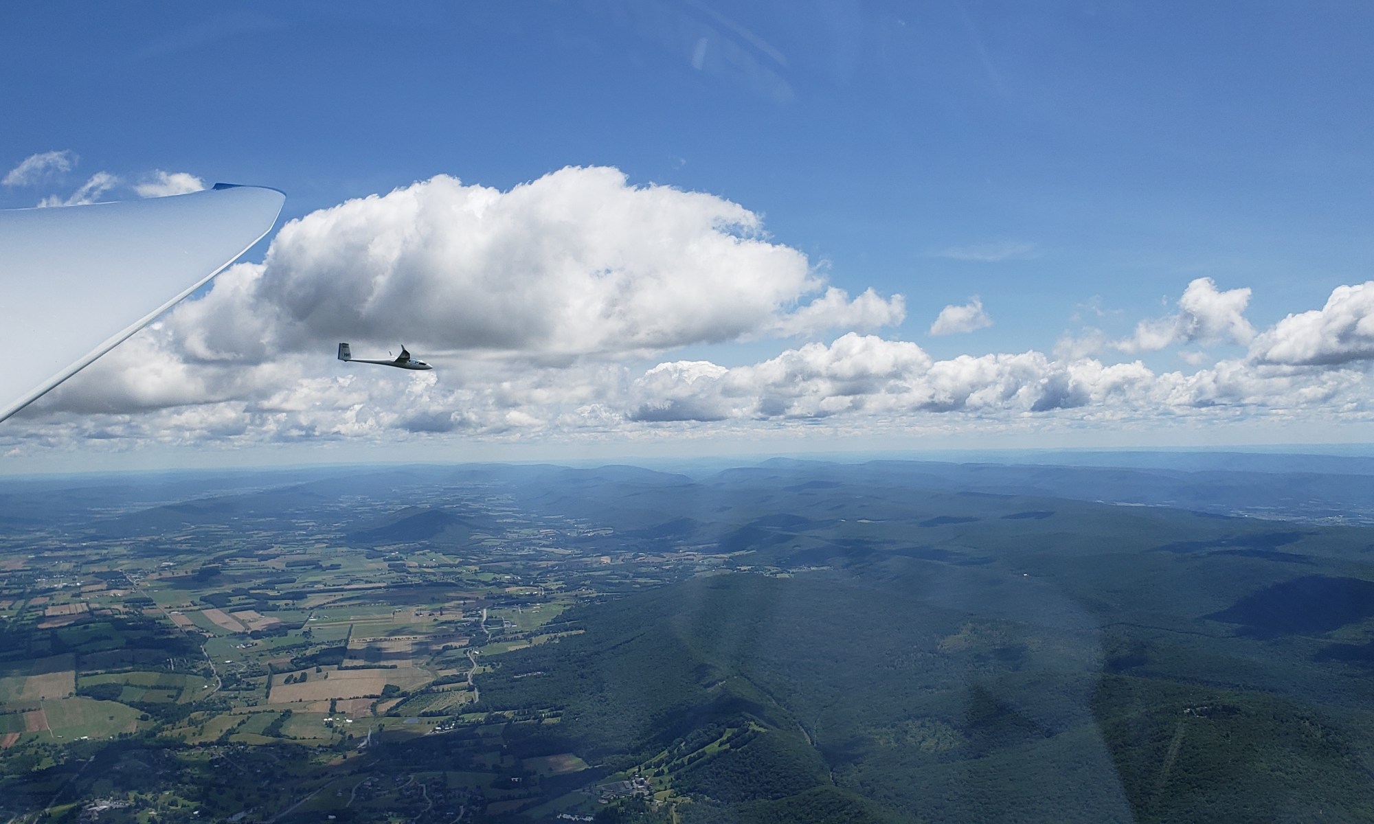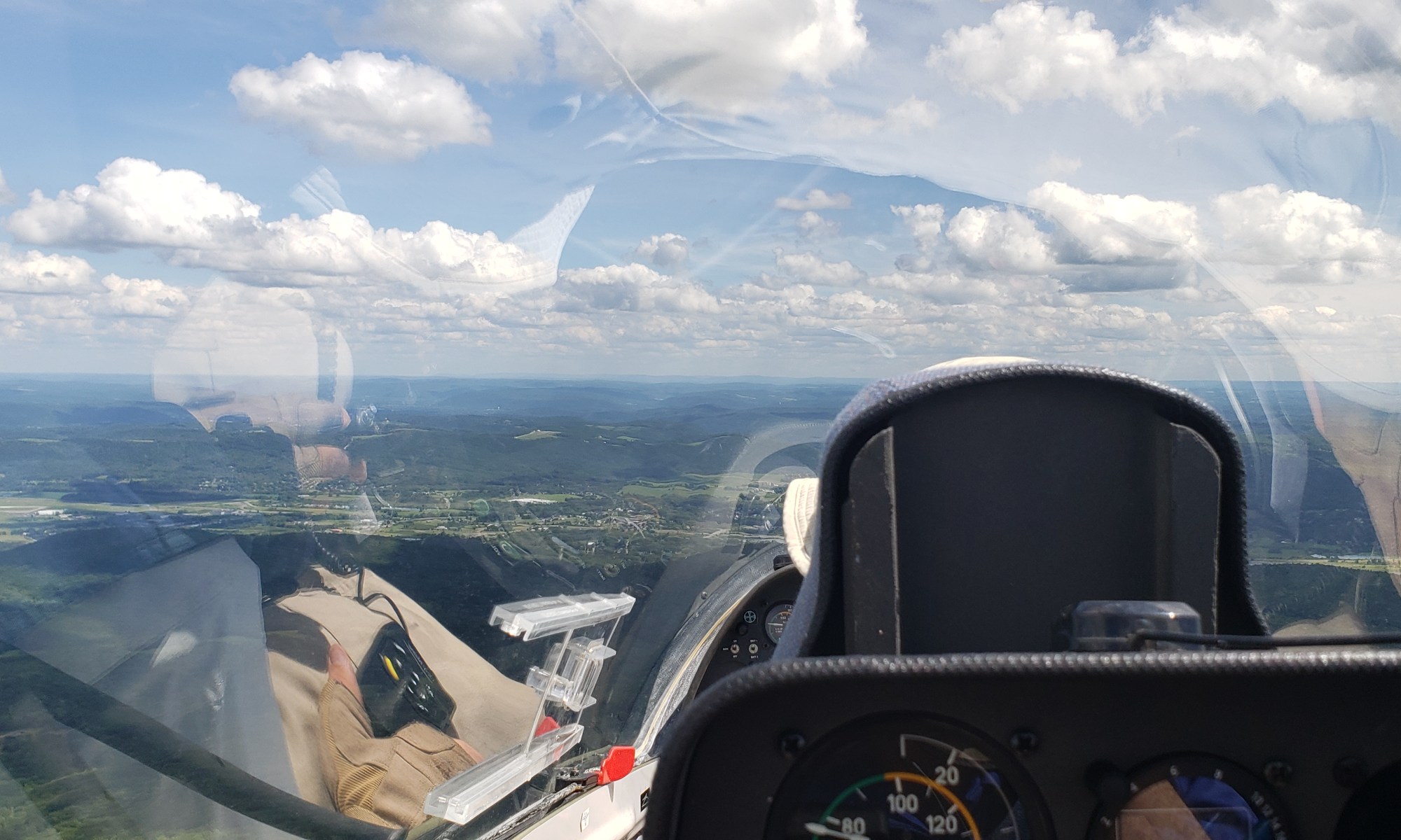 Altoona and Bedford went by without too much difficulty and I was on the Knobblies before I knew it. The effect of this terrain on the air mirrors the broken-up nature of the ground; the air was all torn up and unsettled. I slowed down to 80 knots and struggled to maintain my altitude. The sharp gusts that felt like good thermals encouraged me to start making a quarter of a turn and then get dumped out the other side. Almost all of the clouds failed to generate organized lift. It is necessary to climb between the especially dicey sections between Keyser and Scherr and the tip of Scherr and Hopewell Gap. The sections in between get very low and the landability is quite poor. I made it across after 30 minutes of stressful flying.