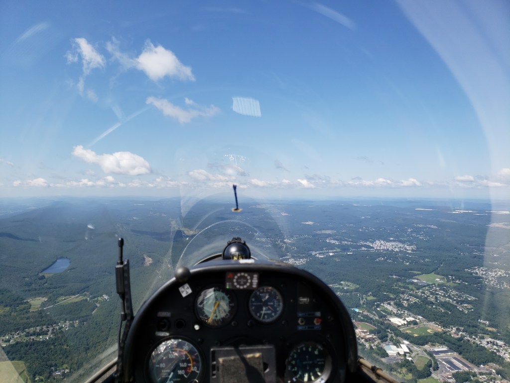 I figured the day would last a long time and aimed high in my task, a 500km triangle. I wasn’t choosy about the turnpoints and came up with a number of variants depending on how the ridge and thermals would work. After releasing from tow, I was a bit cautious about dropping down on the ridge. The wind was not all that strong and there was hardly any turbulence, indicating little convection. But on getting down on the trees, I was greeted with solid ridge lift, sustaining me at 90 knots. Not bad, not at all! Cleaving along the smooth ridge lift, I headed toward Millbrook, enjoying riding above the solid green sheet of leaves covering the mountain.