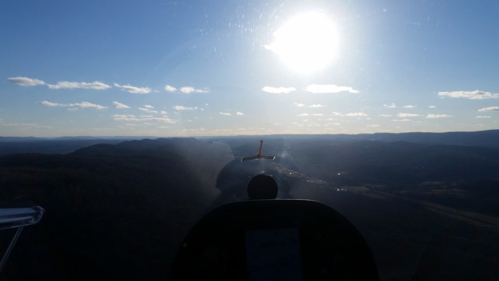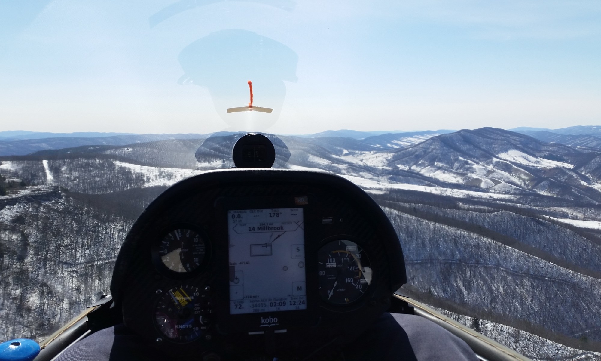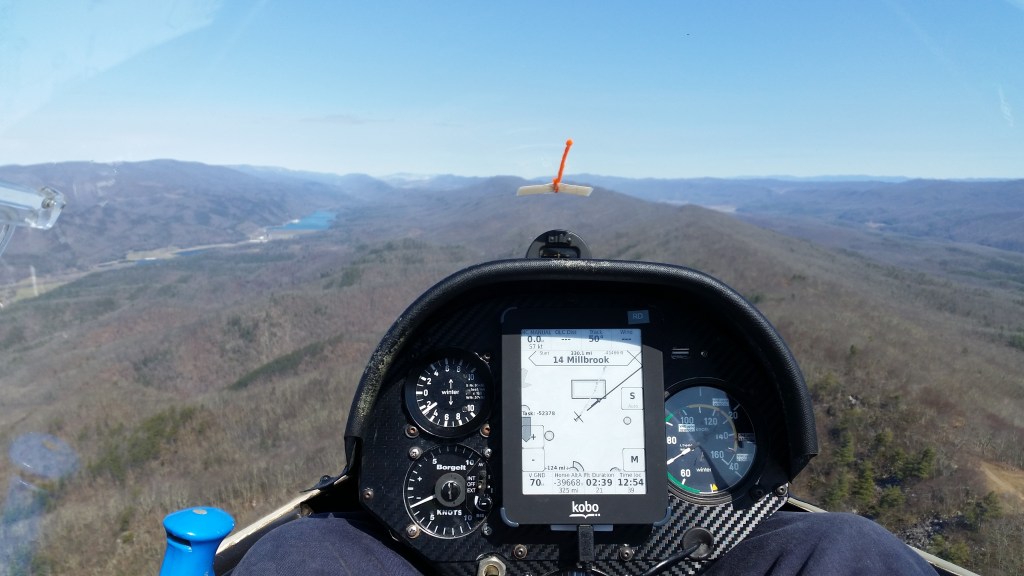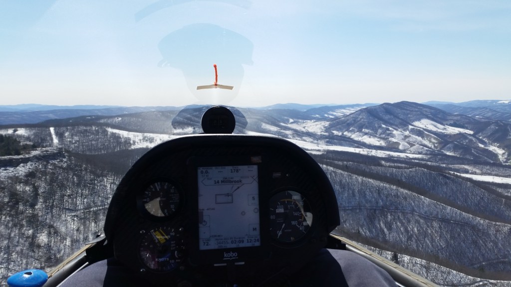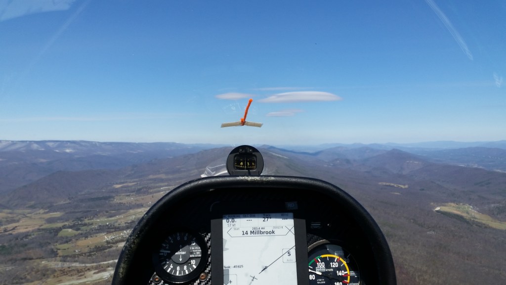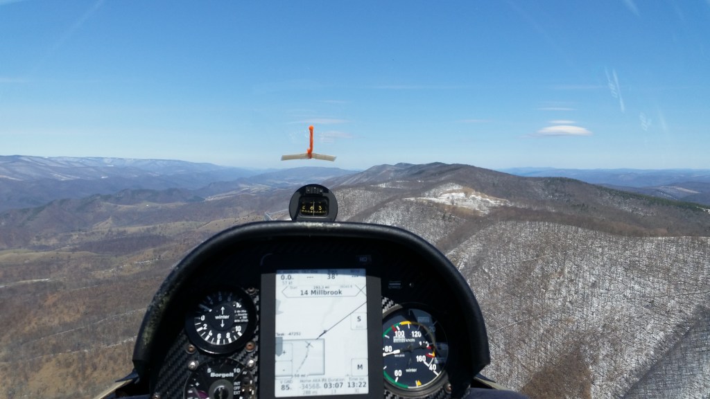 I got back down on the ridge near Hopewell Gap. Now I was tiptoeing my way up the mountain as the wind was not strong enough to simply heave me up it. I quickly found that the ridge was working considerably better 300-400ft above it and was working hard to get into that nice band. With the ridge eeking uphill, it was somewhat tough to do that. Nonetheless, by the time I was at Snowy Mountain, I was now quite well established, cruising along at an honest 85-90 knots. The wind was not strong, but that band was really honest. It took some internal debate to keep going beyond Snowy. The ridge was ever-so-slowly getting lower and the sky was the deadest blue-looking I had ever seen. There’s different kinds of blue. When it has that crisp, deep blue to it, you expect thermals. This one was the misty, still looking blue.
