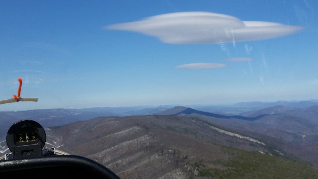 Getting back toward Petersburg, I saw several nice-looking lenticular clouds. Seeing that I had to climb up to go back across the Knobblies, this was a good opportunity to play around and see if I could get into the wave. I tried to get into it on the leading edge of the lenticular, though to no avail. I had a nice climb up to 7500ft, though the wind here was only 7 knots. The transition point into the wave was going to be considerably higher and since I had plenty of height to head across the Knobblies, I kept going.