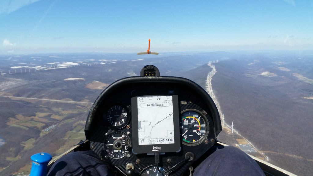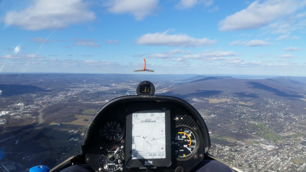 The front ridge is quite a bit different than Blue Mountain. As a whole, it is much less consistent lift-wise. Particularly as you get into Port Matilda/Tyrone, the lift is very spongy. I’ve had several sinking spells that sucked quite a bit of the energy out of the LS4. It seems to me that the instability and the proximity of the plateau mad for sink and turbulence that made the ridge quite a bit less reliable than what I am normally used to. But nonetheless, it was solid enough to never be really worried about falling off, just enough to always be alert.