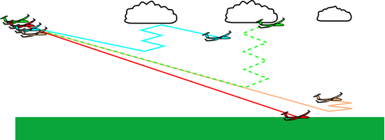 Supposing that we desire to maintain P = 0.001 as the strategic baseline, what can we do to keep the risk of landing out on a given glide lower than this number? To solve this, we first need to zoom in on what happens on a glide. While we glide along, we sample thermal sources by flying under promising clouds, or over prospective ground features like cities, quarries or power plants. When we sample each of these thermal sources, we will either find or miss the updraft. Since clouds are easier to visualize, we will use clouds as our examples from now on, even though this reasoning can also be used in the blue when picking ground sources to fly over.