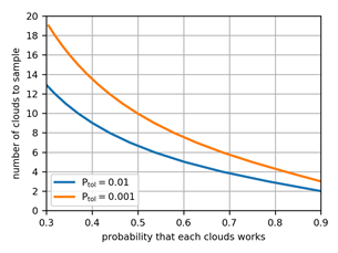We can adjust for this in our model by using a “weighted” coin. For instance, if we were to estimate that 80 percent of the clouds are working, we can account for this over each cloud we sample with a coin that lands on Heads 80 percent of the time. Doing so reduces the total number of clouds we need, to a more manageable four clouds. Conversely, if fewer than half of the clouds are working we need an unreasonable number of clouds in range and it is almost impossible to maintain the strategic baseline.