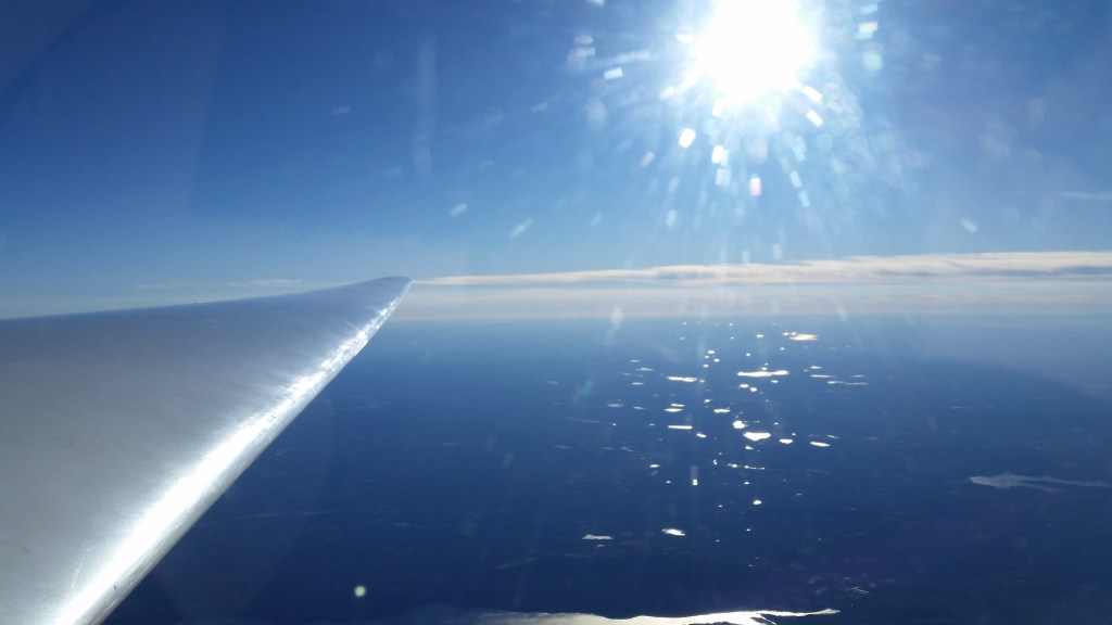 Looking around, it was hard to see anything clearly. The whole cockpit was lit up by the sun off my nose, though all the lakes glittered in the bright orange glow. I could see the Hudson river way below my left wing and the whole Manhattan isle. It felt surreal.